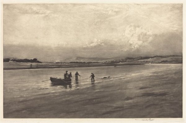 Editor: So, we are looking at “Low Tide,” an etching made in 1927 by Percival Gaskell. It's a very serene scene. The landscape is vast and flat, giving the impression of expansiveness and tranquility. What stands out to you when you look at it? Curator: What immediately strikes me is the romantic depiction of everyday life. Here we have the glorification of a mundane scene elevated to an art form. I am curious about Gaskell's intended audience. The accessibility of prints allowed for wider distribution of art outside elite circles. What do you think about the choice to depict an ordinary landscape? Editor: That’s interesting… I hadn’t really thought about the role of printmaking. I imagine people living in urban environments might find beauty and peace in these scenes of rural labor. Was there perhaps also some influence on the aesthetics, stemming from growing social awareness? Curator: Absolutely. We see this mirroring a broader trend of elevating rural life and labor. This echoes ideas within the Arts and Crafts movement and similar social reform movements where the values of simple living and connection to the land were embraced as an alternative to industrialization and its perceived dehumanizing effects. Do you think this piece embodies such sentiment? Editor: I think it could, definitely. I initially focused on the aesthetic of the image, but when viewed through a historical and social lens, the landscape becomes not just a place, but an idea of connecting people to something essential about nature. Curator: Exactly. And understanding these connections can offer greater insight into the context of art and its role in broader conversations and movements. Editor: I completely agree! I hadn’t initially considered this work in terms of its potential political implications but it certainly seems that appreciating it that way greatly enriches our perception.