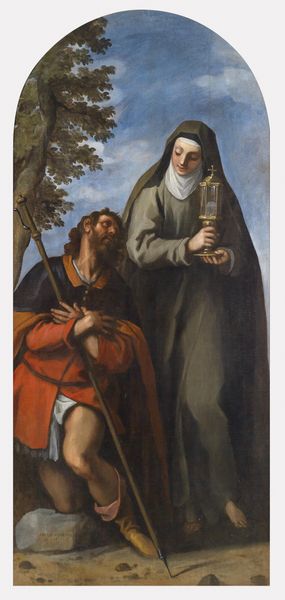 Jusepe de Ribera's painting depicts Saint Francis kneeling, bathed in a raking light that dramatically highlights his upward gaze and outstretched arms. Above him, an angel descends, bearing a scroll, its cascading folds echoing the saint's humble garment. This creates a powerful visual axis, drawing the viewer's eye upward. Ribera's work masterfully engages with the Baroque interest in theatrical composition. Observe how the stark contrast between the tenebrous background and the illuminated figures sculpts form and intensifies the scene's emotional impact. The skull and candle on the altar serve as memento mori, underscoring the transience of life and Saint Francis' spiritual devotion. The composition functions as a visual rhetoric, emphasizing the divine bestowal of grace through the dynamic interplay of light, gesture, and symbolic objects. The stark realism, combined with the ethereal presence of the angel, destabilizes the boundary between the earthly and the divine. This underscores the Baroque period's concern with engaging the viewer through emotional and sensory means.