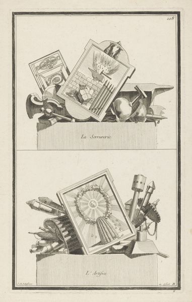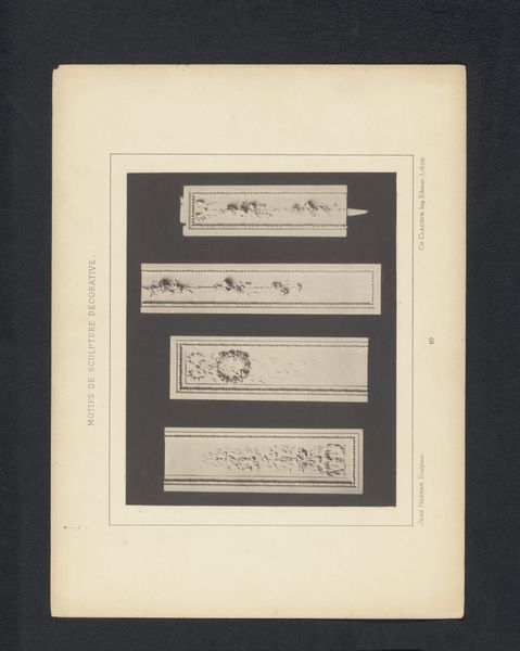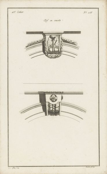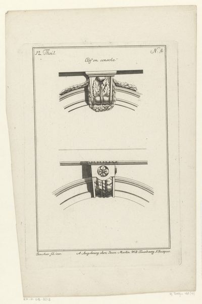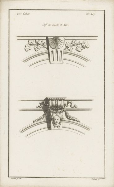 Curator: This intriguing engraving is called "Consoles met schelp en gezicht," dating back to somewhere between 1746 and 1782. Its author remains anonymous. It’s currently held here at the Rijksmuseum. Editor: My initial impression is that it evokes a cool formality. The crisp lines and contrasting values give it a sense of calculated precision. Is this an architect's study, perhaps? Curator: Precisely! These were design concepts for ornamentation, showcasing neoclassical elements. What's fascinating is that even these decorative arts were deeply affected by shifting social and political sensibilities. The transition into Neoclassicism mirrored broader desires for rationalism and order, a conscious rejection of Rococo extravagance often associated with aristocratic excess. Editor: The symmetrical composition of each console is meticulously balanced. Look at the upper design: a shell motif anchoring grape vines on either side. Then, below, a serene face nestled within draped ornamentation. The linear execution gives each form a Platonic solidity, wouldn’t you agree? Curator: Certainly, but I think the placement of that face forces a more humanist reading. These weren’t just designs, they reflected a worldview that positioned humanity and, crucially, European ideals of beauty and intellect as central to even decorative projects. We can see, if we look closer, that the objectification inherent in ornamental art reinforces existing power dynamics. Whose faces were elevated in this way? Who had the authority to create and disseminate such images? Editor: A valid point. Though, I would argue, we also cannot ignore the elegant calibration of shadow and light that creates depth. See how the engraver used carefully hatched lines to define the curvature of the shell, the plumpness of the grapes, or the soft modelling of that almost ethereal face? It speaks to an extraordinary technical skill, wouldn’t you concede? Curator: I do! These objects aren’t monolithic statements, and that interplay you pointed out speaks to the engraver's own interpretation. We must simply stay critically aware of the ideologies these images were used to perpetuate and remember the anonymous status assigned to this creator! Editor: An imperative point. Thank you for enriching my visual reading with those ideas. Curator: And you mine. This detailed work encourages ongoing dialogue.