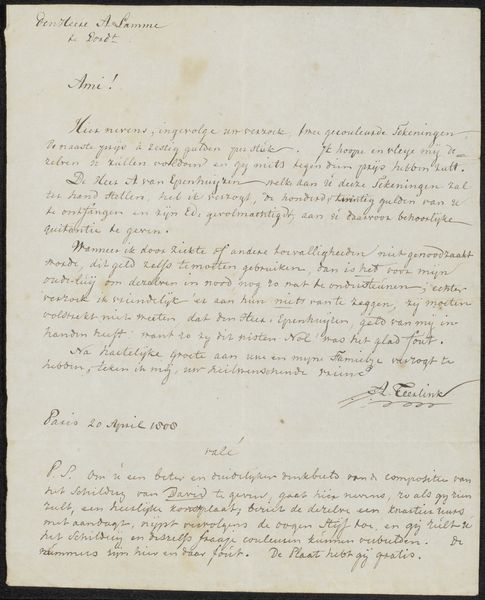 Editor: Here we have "Brief aan onbekend," or "Letter to an Unknown" by Jean-Baptiste Delbecq, likely created between 1813 and 1831. It's an ink drawing on paper. It gives the impression of something quite formal, maybe even a little…official. What strikes you about it? Curator: I'm immediately drawn to the materiality of this piece. Look at the paper itself—the signs of wear and age tell a story. How does the aging paper inform our understanding? And then consider the ink: the consistency, the way it bleeds into the paper in some areas versus the sharp lines in others. Delbecq's labor is evident in the act of writing itself. It begs the question: was the act of writing itself more important than the specific content? Editor: So you're focusing on the physical materials and the writing process...but how does that change our perception of its meaning? Curator: I believe we must also consider who had access to these materials – paper, ink – at that time. How does this reflect the distribution of power and knowledge in society? This isn’t just about aesthetics. How does this specific context shed light on the culture of botanical societies? What was Delbecq’s position within that structure, as the "Secretary?" Editor: That's interesting. It makes you think about the hidden aspects of the artwork. Curator: Exactly. By investigating materials, processes, and production methods, we question not only what art is but also who gets to make it and consume it. The act of handwriting suggests labor, time, a deliberate process… something largely absent from our modern forms of communication. Editor: It almost romanticizes a task so ordinary like writing, when the materials give it more depth. Curator: Precisely. It prompts us to reconsider value and reassess assumptions about “high” and “low” art by exploring labor. The materials and process give it value that transcends the content of the letter itself.
