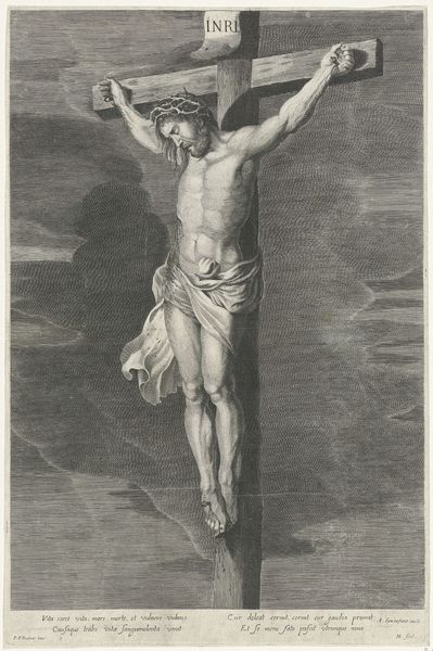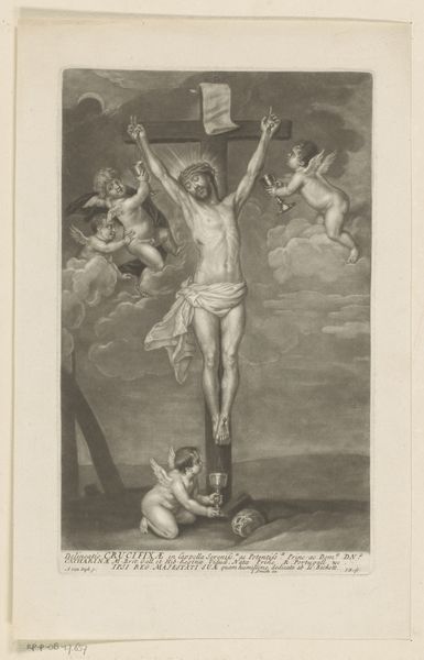 Editor: Here we have "Christus aan het kruis," or Christ on the Cross, an engraving made around 1648-1651. It's attributed to Gilles Rousselet and held at the Rijksmuseum. I'm immediately struck by the dramatic use of light and shadow, really emphasizing the anguish. How do you interpret the overall emotional impact of this piece? Curator: Oh, this one sings to me of devotion and baroque drama. That contrast – *chiaroscuro*, we call it – isn't just visual; it's emotional. It's the agony against the faintest glimmer of hope, see? The angels, almost cherubic amidst the despair, swirling around, adding movement. Think about what Rousselet is doing – not just showing a scene, but inviting you, demanding you *feel* it. Do you see how Christ's body seems both vulnerable and idealized? Editor: Yes, it’s almost a theatrical pose, the way his arms are stretched. Curator: Exactly! It's performance. Consider the period, the fervor of religious expression. Engravings like these circulated widely, bringing grand altarpieces into private devotion. The text at the bottom, "O all ye that pass by", it implores, doesn't it? It seeks a personal connection to the suffering depicted. It's more than art, it’s a visceral invitation into faith. Editor: It’s amazing how much emotion can be conveyed in what seems like a simple black and white print. Curator: Indeed. And look closely at how the city is far away and how that emphasizes the scene on the cross. This piece isn’t just about observation, but about profound, and perhaps beautifully painful, contemplation. Thanks for walking with me!