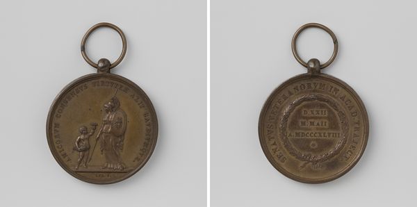 Editor: This medal, commemorating the campaigns of 1813 and 1814, awarded to Prussian soldiers, really grabs my attention. It's made of metal, seemingly from conquered weaponry, and feels heavy with history. What stands out to you? Curator: What interests me most is its very materiality. This medal, crafted from the captured guns of war, embodies a fascinating cycle of destruction and creation. The violence inflicted to obtain the metal, transformed through labor into an object meant to signify honor. What statement does the choice of recycled war materials make about Prussian militarism and its relationship to its soldiers? Editor: So, you are pointing out how war leads to the very materials that glorify it, almost as if violence becomes self-sustaining? Curator: Precisely. We have to consider who would have received this medal, the circumstances, how it would be worn, and the social meaning it conveys. Who benefitted most from this system? To me, this speaks volumes about power structures. The medal romanticizes the act of labor performed by soldiers, perhaps to blind them to the economic system that exploits their courage. Editor: That’s a compelling point. So the medal, meant to symbolize honor and victory, actually reveals a more complex relationship between the soldier, the state, and the spoils of war? The honor isn't freely given, it is, in some ways, already earned through sacrifice that's part of the medal itself. Curator: Yes, it raises crucial questions about valor, the economic drivers of conflict, and how material objects can perpetuate ideology. A medal created for propaganda and ideology. It also reveals the production that forges an individual soldier's identity. Editor: I hadn't considered how the raw material connects to a much broader and harsher social picture, using warfare. Now, looking at it, I see a powerful statement about the resources poured into conflict. Curator: Materiality often speaks louder than intended.