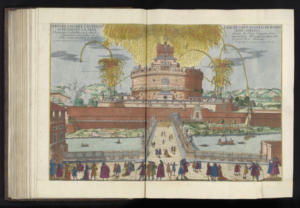 Curator: Today, we're looking at Pieter Schenk’s print, "Engelenburcht aan de rivier de Tiber te Rome," dating back to possibly between 1675 and 1717. It depicts a bustling cityscape with the Castel Sant'Angelo as its focal point, set along the Tiber River. Editor: It’s striking how this print, despite being almost monochromatic, conveys a sense of vibrancy. The architecture dominates the landscape, and the details in the figures crossing the bridge and sailing on the river create a strong narrative element. It feels grand and imperial. Curator: Schenk’s work gives us insights into how Rome was perceived and presented in that era. Engravings like this one functioned as visual documents, showcasing the city's power, religious authority, and artistic achievements, all circulated as prints for a growing public audience. Editor: It’s fascinating to consider the public that would consume this image. How did their existing power dynamics influence how such a visual document might have been interpreted? Who had access to this image? It would be a statement of privilege in so many ways. Curator: Absolutely, prints had broad appeal, yet affordability certainly impacted accessibility and how the messages within the prints might resonate. The cityscape, with its architectural marvels and implied movement, reflects a desire to document not only place, but its socio-political climate as well. Editor: It raises questions about how the artist may have constructed an image of authority for consumption, what details they chose to include or exclude, and how that affects our reading today. The very choice to portray it from this specific viewpoint has meaning. Curator: The placement and dominance of Castel Sant’Angelo signifies, without doubt, the stronghold of papal authority over Rome during the late 17th and early 18th centuries. But look closely—aren’t those military cannons being fired in the background? The implied violence underscores this symbolic domination even further. Editor: Exactly, art serves a public role, both then and now. Studying it helps reveal those layered meanings and inherent power structures. I wonder how the perception of this print would shift across various viewers even today. Curator: That’s the lasting power of art. These images can speak to us across centuries, continuing to challenge our perceptions and assumptions about history and its relation to our present. Editor: I couldn't agree more. It highlights the value of looking at historical narratives, of power, identity and politics, so we can consider the dialogue this art prompts us to continue.