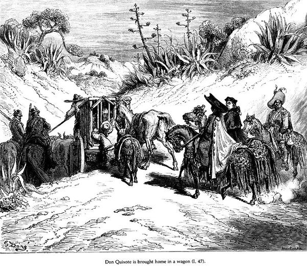 Gustave Doré created this image of Don Quixote, using ink to bring Cervantes's famous character to life. Notice the stark contrast between light and shadow, a signature of Doré's style, which adds depth and drama to the scene. The composition is dynamic, with a flurry of activity centered around Don Quixote and Sancho Panza. The artist uses line work to define form and texture, creating a rich visual tapestry. This image captures a pivotal moment where illusion and reality blur. Don Quixote, ever the idealist, sees noble ladies where there are only peasant women, a delusion that reveals the tension between perception and truth. Doré’s graphic style enhances the narrative, inviting us to question the nature of reality and the power of imagination. The detailed rendering of each figure, from the rough textures of their clothing to the expressions on their faces, invites us to consider how art destabilizes established meanings. Is this a tale of delusion or a commentary on the ability of art to transform the mundane into the extraordinary?
