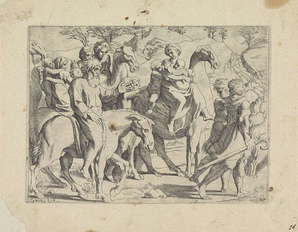 Editor: Here we have Giovanni Lanfranco's "Baptism of Christ," an etching from 1607, housed at the Rijksmuseum. I'm struck by the almost frantic energy conveyed through the delicate lines of the etching. What stands out to you? Curator: Considering its materiality as a print, we must appreciate this piece within a larger network of image production and distribution in the 17th century. Prints like these weren't just aesthetic objects; they were commodities, produced through collaborative labor and disseminated to a burgeoning market hungry for accessible art. The etching process itself, biting into the metal plate, allowing for multiples, reflects this ethos of accessibility and reproduction. Editor: So, it’s less about individual genius and more about...production? Curator: Precisely! Think about the social context. Who commissioned it? How would people engage with it? These prints played a key role in spreading religious narratives and artistic styles, serving both devotional and decorative purposes. The materiality dictates that it wasn’t only made for the elites. Editor: The details still seem incredible for what sounds like mass production. It's interesting to consider how labor impacts our perspective. Does knowing its background alter your appreciation of it at all? Curator: Absolutely. Understanding the labor and dissemination of this print redirects our focus from pure aesthetics to production and its subsequent consumption within period society, ultimately raising crucial questions regarding art as labor rather than just a luxury object. Editor: I hadn't thought about it that way at all. Seeing art as work really changes how I view these historical pieces! Curator: Indeed. Now, we can better appreciate the historical function of prints like this.