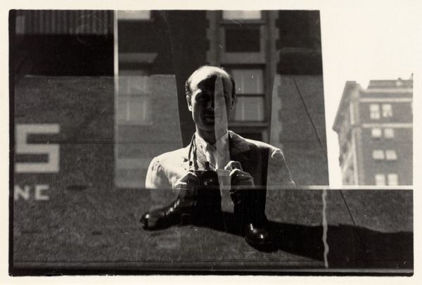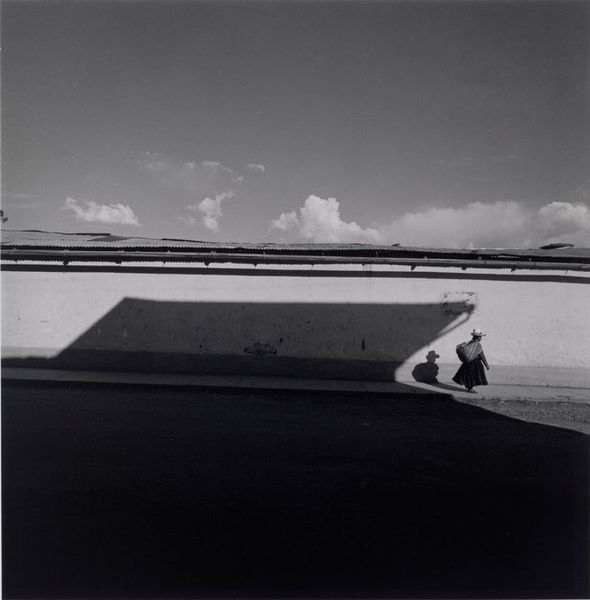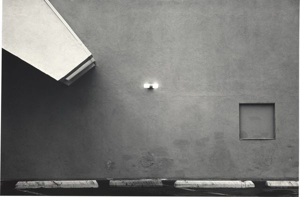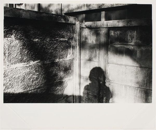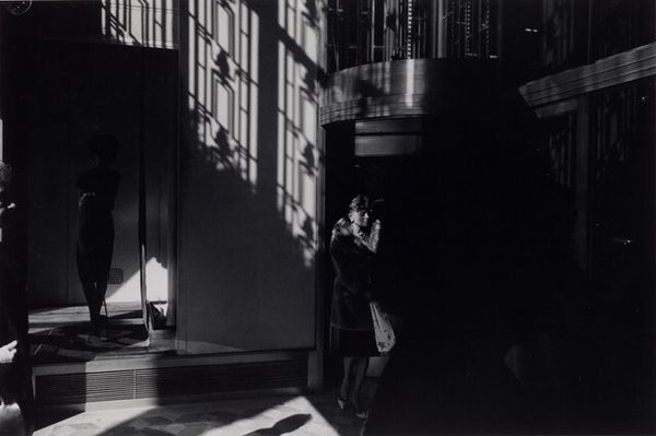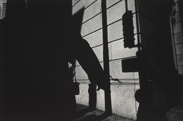 Curator: Before us we have Harry Callahan’s “Chicago,” an evocative gelatin silver print. The figures strike me immediately – they seem so isolated, almost staged. Editor: Yes, the graininess gives it a melancholic quality. Look at how the stark, industrial setting dwarfs the figures. I wonder about the labor conditions in Chicago at that time; Callahan presents a certain urban alienation. Curator: The composition is quite deliberate: note the sharp contrast between light and shadow, and how the subjects are framed by geometric forms. It's a brilliant study in visual relationships. Editor: I see the textural contrast as equally important. The rough concrete juxtaposed with the smoothness of their skin, it emphasizes the human element against the backdrop of mass production. It's a very tactile image. Curator: Indeed, the materiality of the photograph itself—the tonal range achievable with gelatin silver—heightens the emotional resonance. Callahan pushes the medium to its expressive limits. Editor: He certainly captured a sense of the urban experience, channeling its grit and its fleeting moments of human connection. It's a complex picture that continues to raise questions about the relationship between people and their environment.