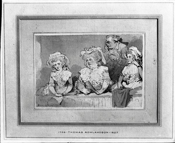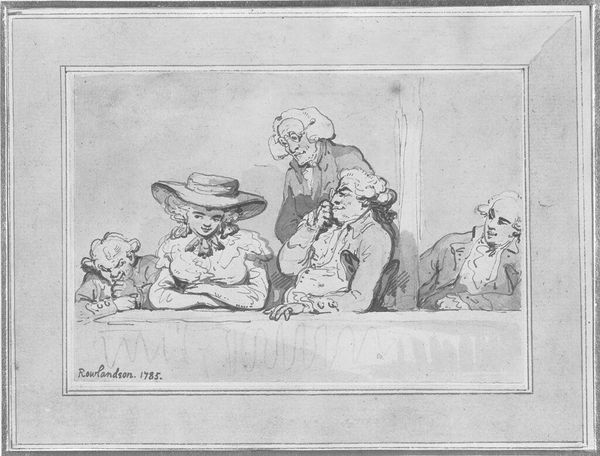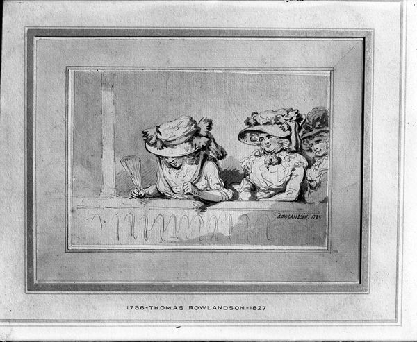 Curator: Thomas Rowlandson's "Side Box at the Opera" presents a fascinating study in ink wash, doesn't it? The gestural lines give it such immediacy. Editor: It does—there's a palpable sense of satire here. The figures in the box, especially the older gentleman, seem to represent a jaded aristocracy. Curator: Precisely. Note how Rowlandson uses contrasting light and shadow to accentuate the character's features, amplifying their expressions. The faces almost become caricatures. Editor: Yes, and the woman with the fan—she embodies a kind of performative boredom, using the fan almost as a shield against the spectacle, both onstage and within the box itself. It's a mask of cultural indifference. Curator: Indeed. The composition, though seemingly casual, directs our gaze through a series of angular forms, leading to the focal point of the older man, a central figure. Editor: The cultural symbolism resonates so strongly—the opera box as a microcosm of societal tensions and the ritualized performance of class distinctions. Curator: It’s remarkable how effectively Rowlandson employs line and form to express such intricate societal observations. Editor: Absolutely. The details really bring alive the mood and context of the era.