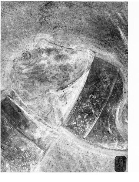 Editor: This is an X-radiograph of "The Stigmatization of Saint Francis," attributed to the School of Giotto di Bondone. It's fascinating to see the painting stripped down like this. What do you see when you look at it? Curator: I see a map of labor and materials. The X-ray reveals the underpainting, the artist's process laid bare, exposing the materiality of the work. How does this inform our understanding of its original consumption? Editor: That's interesting. I hadn't considered the layers of production like that. Does knowing this change how we should view art from this period? Curator: Absolutely. It challenges the traditional focus on the artist's singular genius, highlighting the collaborative nature and material conditions of its creation. It reveals a network of labor involved in its making. Editor: I see how understanding the materiality shifts the focus. It makes you think about the whole context of its creation, not just the final image. Curator: Exactly. Material analysis like this unveils social histories embedded within the artwork.