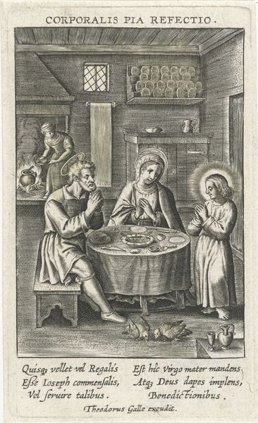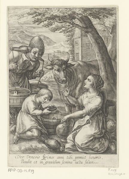 This is an etching by Justus van den Nijpoort, titled "Interior of a Farmhouse with Five Figures." The composition, framed by an oval, immediately plunges us into a scene of domestic intimacy, rich with detail and tonal variation achieved through dense, cross-hatched lines. The eye is drawn to the central mother and child whose verticality is stabilized by the horizontal lines of the bench and the floor. Nijpoort uses contrasting areas of light and shadow to define forms and create depth. The figures are arranged in a seemingly casual manner, yet the careful positioning creates an intricate interplay of gazes and gestures that invite us to decode the dynamics of their relationships. The image can be examined through the lens of semiotics, where everyday objects and actions become signs laden with cultural meanings. The drinking, the tools, and the child's play each suggest a network of social and moral values. The formal structure, therefore, serves as a framework for a broader cultural narrative, reminding us that art's power lies not only in its aesthetic qualities but also in its capacity to reflect and shape our understanding of the world.