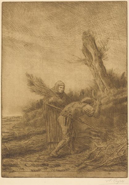 Eugène François de Block created this etching, "Two Figures Praying by a Cross in the Woods," with delicate lines that evoke a sense of solemnity and introspection. The figures are set against a dense backdrop of trees, their forms rendered with a soft, almost blurred quality. This creates an intimate and spiritual atmosphere. The composition is structured around the stark verticality of the cross, contrasting with the hunched, supplicating postures of the figures. The cross, as a sign, dominates the visual space, acting as the focal point for both the figures' devotion and our attention. De Block uses the etching technique to explore the interplay between light and shadow, which adds depth and a sense of mystery to the forest setting. The figures, rendered with empathy, engage in a ritual that signifies not only their personal faith but also perhaps a broader cultural narrative of repentance. The deliberate haziness of the scene may encourage us to question the boundaries between the physical and spiritual realms, inviting a contemplation of mortality and faith.