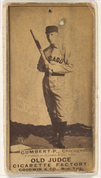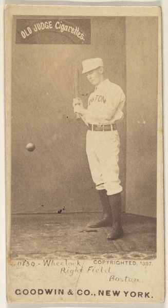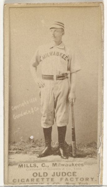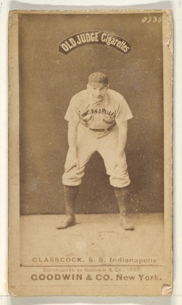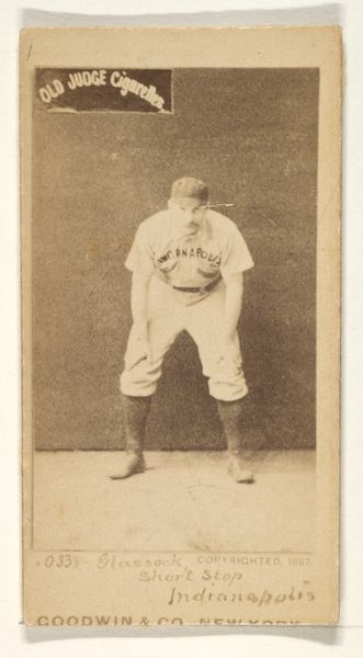 Curator: Let's discuss this albumen print from 1887. It's part of the "Old Judge" series of baseball cards, specifically a portrait of John Thomas "Tug" Arundel, a catcher for Indianapolis. Editor: My initial impression is that of a staged formality that still captures the nascent commercialization of sports, and how everyday culture—like cigarette consumption—helped forge a sense of collective identity. It feels very much of its time. Curator: Absolutely. Note the meticulous composition: Arundel's stance, the centered framing. The tones, sepia-soaked, add to its feeling of dignified antiquity. It emphasizes line and shape rather than textural details. It's almost like a classical bust transported into a baseball diamond. Editor: That sepia tone evokes nostalgia, of course, but also, given it's a cigarette card, invites us to consider the broader historical context. Mass media, the burgeoning sports industry, and, of course, the pervasive, often unregulated marketing of harmful products like cigarettes. Curator: Precisely, but within those bounds, the clarity of the albumen print really shows how Goodwin & Company exploited new photographic processes, how the image structure works to communicate idealized attributes and how they capitalized on early celebrity culture. The crisp edges against a diffused background—a careful interplay. Editor: It's also a commentary on masculinity. A constructed masculinity centered on athleticism and the culture of leisure – and, tacitly, on habits that directly undermined the athlete's physical form. A tragic paradox, when viewed from today's vantage. These types of baseball cards reinforced gender norms and commodified sporting heroes, selling not just a product, but also a vision of ideal manhood. Curator: You raise valid and uncomfortable points about how it normalizes a specific masculine prototype through structure. Though my focus draws toward formal organization and visual techniques. It provides structure for its meanings—like how Arundel almost pops from the backdrop in sepia, or its crisp edge. It makes its semiotic purpose extremely apparent. Editor: Yes, both readings aren't mutually exclusive. Considering both composition and historical context grants a layered approach. Ultimately, it reminds us of how much popular art both reflects and molds societal norms and desires, with some nasty and unethical elements thrown in, even from this humble baseball card. Curator: An unexpectedly insightful glimpse, wouldn’t you agree? Editor: Quite so. The layering makes for surprisingly rich study.