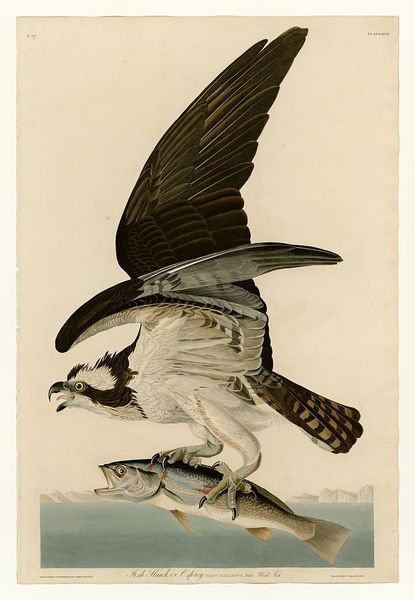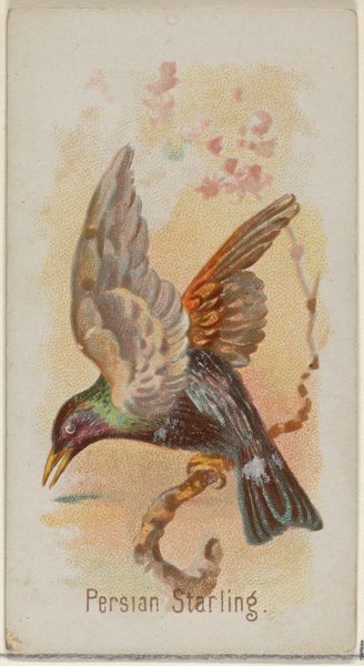 Curator: Ah, isn’t this a marvel of bygone marketing? What we have here is "The Tropic Bird" a drawing and print enhanced with watercolor from Allen & Ginter's "Birds of the Tropics" series, dating all the way back to 1889. It's a cigarette card, originally tucked into packs. Editor: It feels… surprisingly melancholic, considering it's trying to sell me something. That bird, diving towards the water—it’s so solitary against the muted sunrise, as if it's searching for something lost. Curator: It’s fascinating how these promotional images, designed for mass consumption, were influenced by movements like Japonisme. Editor: You can really see it in the composition and simplified forms—the flattened perspective, the focus on line… But tell me, why this particular bird? Why feature it so prominently? What statement is the patron attempting to project? Curator: Maybe it's about aspiration, luxury, that exotic allure of far-off lands implied in its 'tropic' origin. Or perhaps they responded to the innate symbolic qualities this particular species can represent such as grace and far-sightedness. Tobacco and watercolor seem worlds apart, but then so do we often as artists ourselves! Editor: You know I find that the bird's wings remind me of ukiyo-e prints with the dramatic use of shading—really interesting choice given the explicit commercial intent of the card! Though there isn’t the human element of life and the ephemeral that that genre attempts to grapple with. And I still return to that feeling of melancholy. It is rather unexpected for promotional artwork, I will give you that. Curator: Precisely, it transforms this advertisement into something that speaks to us differently than just its product. I will add that, overall, it just goes to prove that there is almost something strangely… endearing and rather wonderful, don’t you think? Editor: I can’t argue that it provokes deeper, lasting thought that reveals more with each moment in its presence. In the end, these pieces do show how everyday design can sometimes fly far beyond its original purpose.