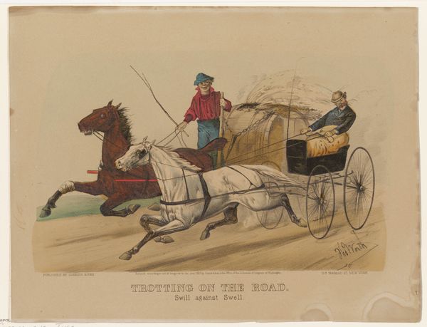 Curator: Welcome. This print, dating roughly from 1815 to 1878, is entitled "Drie mannen in een rijtuig" by Gaetano Dura. Editor: My initial reaction is one of somewhat comical unease; the driver, perched precariously, brandishing his whip—it suggests a rather frantic, unstable social scene. Curator: Note the deliberate diagonal composition, propelling the viewer's eye from the lower left—with the small dog—upwards and rightwards toward the escaping horses. This deliberate, almost theatrical arrangement is consistent with Romanticism. Editor: True. But it's the figures themselves that intrigue me. We see what appears to be a carriage transporting religious figures—note their attire—almost careening through the streets. There's a visual tension between their apparent piety and the recklessness of their transport. What might that imply about social or religious authority? Curator: Dura has very effectively captured the textures of the scene. Observe the linear quality in the horses’ manes versus the soft wash of color suggesting ground. See the geometric structure within the framework of the carriage. These sharp delineations create the illusion of movement and emphasize formal balance and counterpoint. Editor: It feels allegorical. Consider the societal hierarchies present—the presumed wealth affording the carriage ride contrasting sharply with the labor of the driver. Is it possible Dura is hinting at a critique of social inequities within the religious and ruling classes? Perhaps also of the church’s compliance? Curator: The print employs a subtle color palette of muted earth tones contrasted by bolder hues of blue and red to define forms. It contributes to a powerful visual dynamic, drawing one's eye into the heart of the narrative conveyed here. Editor: What stays with me is the feeling of implied speed combined with implied social critique. Dura positions this scene within an ambiguous context—one where religious authority, rapid social change, and possible dissent coalesce, and its legacy is an artwork steeped in ambiguity. Curator: Indeed, its lasting appeal resides in the interplay between controlled design and dramatic energy.