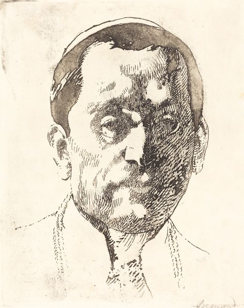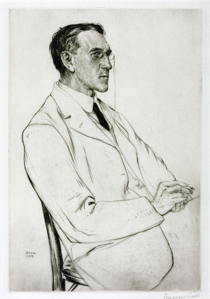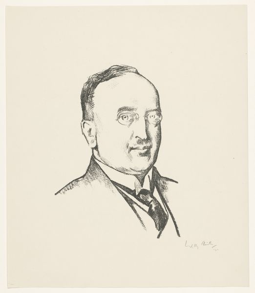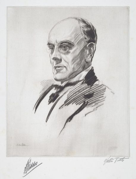 Editor: Here we have Walter Tittle's portrait of "Monsieur Rene Viviani, Former Premier of France," created in 1921, using graphite or charcoal, I believe. The man's gaze is rather intense, and the medium seems to capture every line on his face. What do you make of it? Curator: I'm immediately struck by the *process* here. Consider the materiality of graphite itself – a mineral, extracted, processed into a tool. Tittle uses that tool to portray a man, yes, but it’s also a physical record of labor. We see the artist's hand, the pressure applied, the accumulation of graphite on paper. Editor: So you’re saying the portrait is not just about Viviani, but also about Tittle's act of making? Curator: Precisely. Look at the unfinished quality below the suit. It exposes the working methods, the "raw materials," if you will. In that sense, isn't the image also about *reproducing* images, making this one potentially infinitely reproducible using techniques such as printmaking. This moves the artistic merit from concept and into tangible goods that can be bought and sold. And, we shouldn’t forget that this portrait depicts a *former* premier – a man defined by his labor within a specific political-economic structure. His "value" is shifting, subject to change. Editor: That’s a completely different way of seeing it! It’s almost like a document of industrial techniques. I hadn’t considered the socio-economic aspects of portraiture, especially with someone who held public office. Curator: It shifts our attention from the individual to the structures of power that shaped him, and how that is then materially expressed. The medium and how it is produced speak volumes. Editor: I'll never look at a simple portrait the same way again. I’ll definitely pay more attention to not just who, but *how* something was made, and *why*.