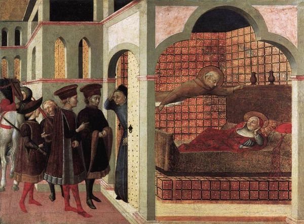 Editor: This is Giotto’s fresco, *Apparition to Fra Agostino and to Bishop Guido of Arezzo,* painted around 1300. It’s a narrative scene, full of architectural details. There’s almost a stage-like quality to the composition. How do you interpret the staging of the figures in relation to the architectural setting? Curator: The fresco reflects the complex power dynamics of the church at the time. Notice how the architectural setting not only frames but also compartmentalizes the figures. The structure itself feels like a theater, where roles and rituals are carefully enacted and observed. Giotto is highlighting the performative aspect of religious authority. The architectural backdrop elevates and legitimizes the actions unfolding within it. What power structures do you think Giotto might be subtly critiquing here? Editor: I see what you mean. It's as though the architecture is a tool of the church, emphasizing the separation between the holy men and the implied audience. The bishop lying ill to the side...is his power waning? Curator: Precisely. Consider also where this fresco is situated: within the Basilica of Saint Francis. The Franciscans were, in many ways, challenging the established church hierarchy with their focus on poverty and direct engagement with the poor. Giotto, through his masterful use of spatial arrangements, comments on these internal struggles. How does understanding this tension shape your perspective? Editor: It makes me think about the very public nature of religious imagery and its function in negotiating those power dynamics. It wasn’t just decoration, but a statement. Curator: Exactly! Frescoes like these were pivotal in shaping public opinion and reinforcing, or even subtly questioning, existing social and religious orders. This really changes our perception. Editor: Definitely. It’s fascinating to see how much the historical and social context can impact the interpretation of an artwork.