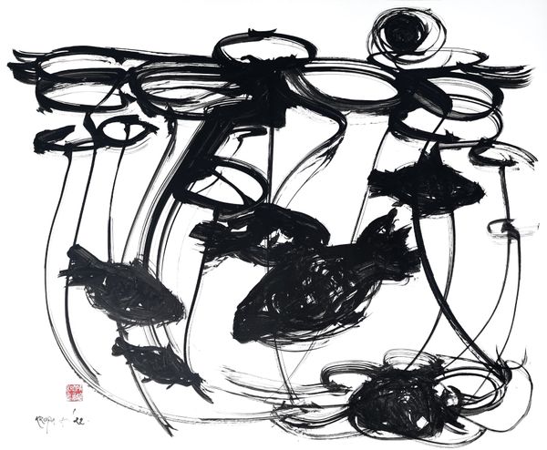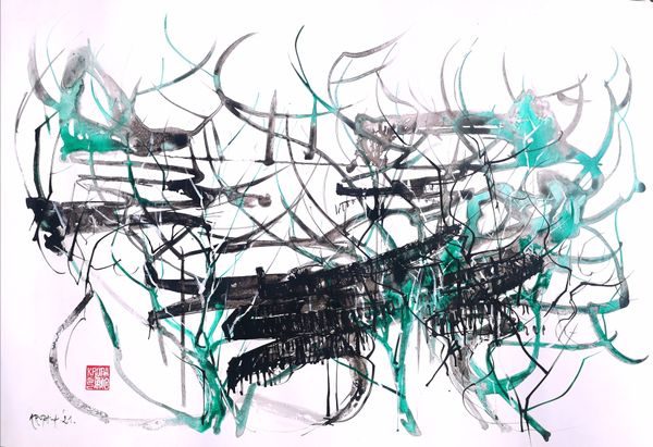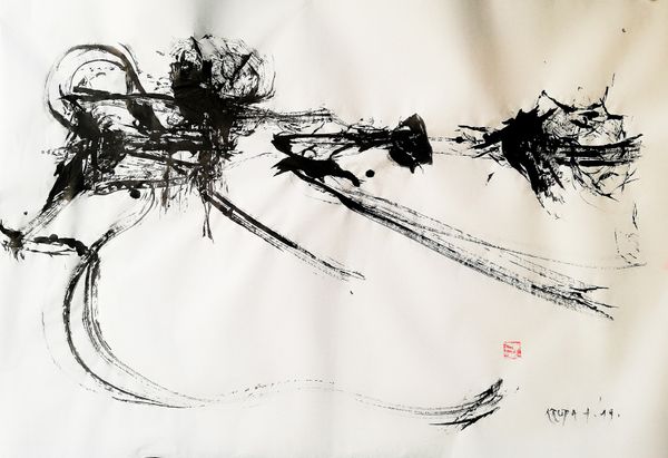 Alfred Freddy Krupa created 'The bend of the river Korana near Mekušansko polje' using ink. It's a striking composition of black lines and washes against a stark white background. The contrast immediately draws you in. Krupa masterfully manipulates the brush to suggest forms and textures. Notice how the ink varies from dense, opaque blacks to translucent grays, creating depth and atmosphere. The sweeping lines create a sense of movement, mimicking the flow of the river and the sway of the trees. Looking closer, one sees a connection to Eastern calligraphy. The economy of line and the emphasis on gesture. This invites us to see the painting not just as a landscape but as an expression of the artist's inner landscape, a space where the external world meets personal experience. The river bend becomes a symbol, perhaps, of life's twists and turns. Ultimately, the stark simplicity of Krupa’s approach reminds us that art can be both deeply personal and universally resonant. It offers a space for reflection.