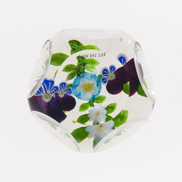 Curator: What immediately strikes me is its almost meditative quality—like a perfectly still, contained garden. It's deceptively simple. Editor: We're looking at a glass paperweight, probably crafted by Baccarat Glassworks between 1845 and 1860, currently residing at the Art Institute of Chicago. It’s decorative art at its finest, blending form and function. Curator: Function, yes, but its primary appeal, to me, comes from its almost sacred geometry. Those carefully arranged floral motifs—there's something deeply symbolic, almost heraldic, about them. Each flower type and color could have specific meanings tied to Victorian floral language. Editor: Right, those jewel-toned pansies – symbols of remembrance, perhaps? And the central white blossom—a symbol of purity or even death when surrounded by the deeper hues? You start thinking of Vanitas paintings of the Dutch Golden Age: here today, gone tomorrow, but frozen for all time in a single artwork. Curator: Precisely! And encased in glass like this it adds a protective layer almost to sanctify a certain image in one’s life, giving us clues of what might’ve been the collective imagination of the artist as well as of the audience of these Baroque inspired items during the Victorian era. It is not necessarily about life's decay, but rather its persistent, hopeful essence. Editor: Absolutely. Glass itself, being fragile yet enduring, becomes part of that visual message. The weight grounds those delicate ideas, anchoring them in the everyday. Curator: You get this perfect balance between the tangible and the ethereal, a dance between beauty and melancholy and permanence in an object designed for simple, everyday use. What a subtle way to communicate complex emotion! Editor: It reminds me how, in a way, it is an echo of how art objects create the very feelings they evoke in the human observer through the use of color, imagery, materials, technique and texture in perfect synchronicity. I want to grab this time-stopping microcosm in the palm of my hand, forever.