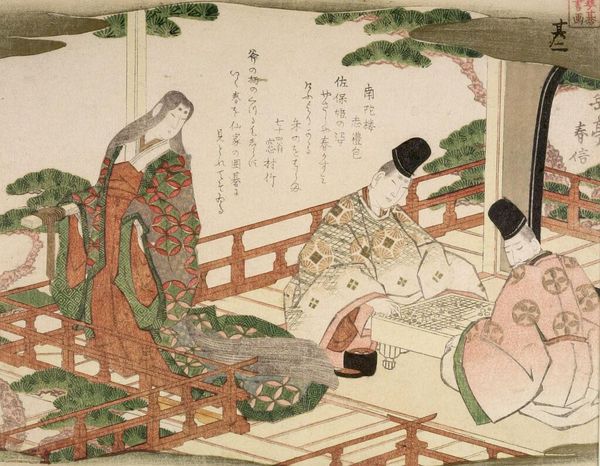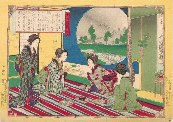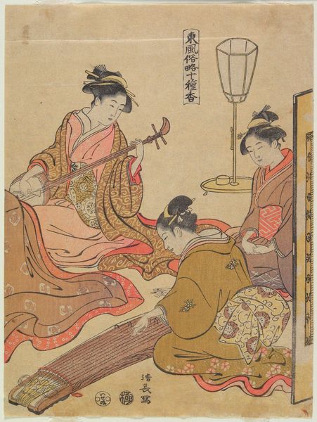 Kitagawa Utamaro created this woodblock print, Three Seated Ladies with Lanterns. Woodblock printing, or *ukiyo-e*, involves carving a design into a block of wood, inking it, and pressing it onto paper. Utamaro masterfully utilized the grain of the wood to create subtle textures, like the delicate patterns on the women's kimonos. The flat, bold colors are achieved by carefully applying layers of ink to different sections of the woodblock. Notice the precision and skill required to align each color perfectly, especially in the intricate details of the lanterns and the checkered screen. The *ukiyo-e* tradition was deeply tied to the rise of a merchant class and a culture of consumption. These prints were affordable, mass-produced artworks, reflecting popular taste, and enabled a wider audience to enjoy art. By focusing on the everyday lives of women, Utamaro blurred the lines between fine art and popular culture.