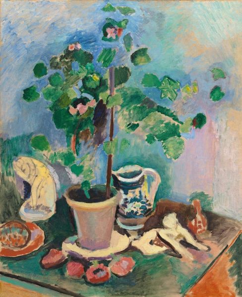 Curator: This is Henri Matisse’s “Roses De Noel Et Saxifrage," painted in 1944. We can observe his experimentation with oil paints and rendering of intimate, domestic scenes. Editor: Wow, it’s such a vibrant burst of color. Like a defiant garden blooming indoors during… well, 1944. I get a sense of cozy resistance, if that makes any sense. Curator: It does. Considering the wartime context, we could read this as a material assertion of domestic space and continued cycles of consumption even under duress. The production of pleasure in bleak circumstances. Note also the use of floral patterns repeated in the wallpaper behind and the tablecloth—likely printed fabrics that democratized decorative arts. Editor: That’s it, cozy resistance. It's so Matisse, using bright color and accessible imagery to create joy amidst what must have been pretty bleak realities. I’m thinking about how creating that tabletop arrangement could be seen as a defiant creative act. Curator: Exactly, disrupting traditional hierarchies by blurring the boundaries between fine art and the applied arts that often get sidelined or diminished due to gender or other cultural prejudices. How art historical expectations about painting were being stretched, negotiated, and redefined to find and fashion beauty during immense periods of precarity and grief. Editor: Yes. A very deliberate act. This simple painting suddenly feels anything *but* simple. All these shapes become vessels—holders—not just of flowers and fruit but of memory and resilience. What was easy is hard again; to *not* ignore is, perhaps, to act. Curator: An interesting perspective, and perhaps how Matisse himself negotiated a sense of continuing forward. I appreciate you sharing your insights on this. Editor: And I yours. I’m going to carry this little tableau of stubborn beauty in my head all day.