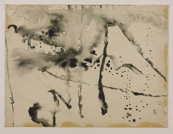 Editor: This is Jacob Kainen’s 1973 monoprint, "Invader." The stark contrast between the blacks and grays, along with those forceful lines, gives it an almost violent energy, doesn't it? What do you make of that tension in the work? Curator: Tension... Yes! It's like a stormy thought breaking the surface. It also whispers of memories trying to coalesce, like a phantom limb twitching back into being. The lines feel almost like seismic activity, charting the inner tremors we rarely show the world. Do you think it’s aggressive, or is there something vulnerable lurking beneath? Editor: I initially felt aggression, but you’re right, there's a vulnerability too. The smudges around the bolder strokes make it feel less decisive, more exploratory... Curator: Exactly! Think of how a poem often hides its deepest truths in its pauses, in the unwritten spaces. This print operates in that realm of suggestion. What if “invader” isn't about a conquering force, but about an unwelcome feeling barging in, disrupting our peace? Editor: So it could be about an internal battle? That's a completely different read than my first impression. Curator: Monoprints lend themselves beautifully to the unique moment, a single chance to capture something fleeting. The happy accident of the ink spreading is itself a story. Perhaps that unexpected dispersal is the "invader," subtly shaping what was meant to be a planned form. Editor: I love that thought, seeing the process itself as the intruder! This definitely makes me look at the print—and monoprints in general—in a new way. Thanks! Curator: The pleasure was all mine. Art thrives in shared moments of revelation!
