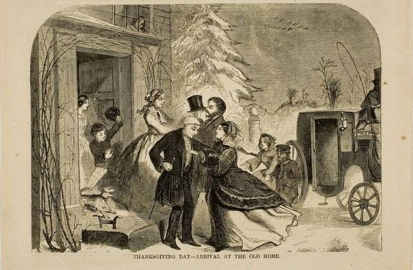 Editor: This is a fascinating image, "New York Charities - St. Barnabas House, 304 Mulberry Street," by an anonymous artist. I am struck by the division of space, the top area feels lighter and more hopeful than the bottom. How do you interpret this composition? Curator: Observe how the artist employs vertical and horizontal divisions to construct meaning. The upper register, with its framed doorway and inscription, offers a sense of promise, while the lower depicts a more grounded, communal setting. The stark contrast in tonal values and the strategic placement of figures guide our reading. Editor: So you’re suggesting that the structure itself is key to understanding the artwork's message? Curator: Precisely. The composition, along with the interplay of light and shadow, directs our gaze and underscores the thematic dichotomy. Consider how the artist manipulates form to convey a narrative of hope and community. Editor: That's a helpful way to consider the piece; I was missing that. Thanks! Curator: It is in understanding the language of form that we truly begin to decode an image such as this.