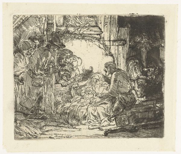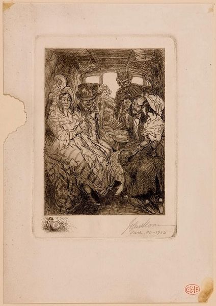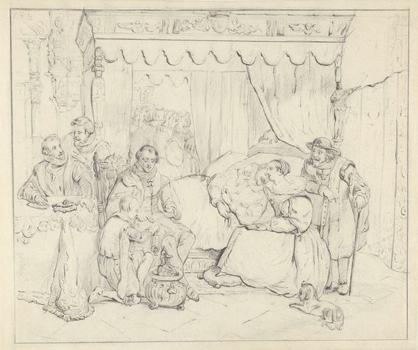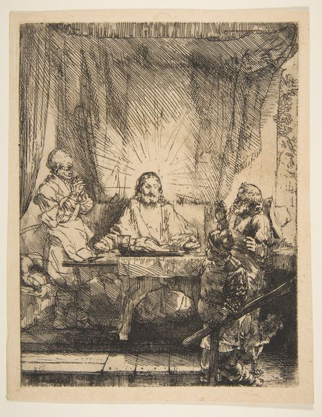 Curator: What a fascinating drawing—it looks like a whirlwind of impressions caught on paper. Editor: It does have a restless energy, doesn’t it? I sense a blend of anticipation and perhaps, a slight unease hanging in the air. Curator: Well, this is James Ensor’s "The Supper at Emmaus," created between 1885 and 1886, using both pen and pencil. It captures that pivotal moment when Jesus reveals himself to his disciples. Editor: Ah, Ensor! That throws a different light on it. Given his anti-establishment stance, one can assume that the disciples aren't neutral figures within his broader criticism of societal power dynamics and religious institutions of his time. The very materiality, this fleeting sketch-like quality, makes me wonder if it wasn't his interest to portray faith in any classical, glorified way. Curator: Exactly! Notice how he utilizes hatching and cross-hatching? The frantic energy conveyed hints at the immediacy of the event, but also suggests a rougher, less polished form than traditional religious painting. Look closely; you see the frantic, almost desperate quality of the lines? The rapid execution must have demanded incredible dexterity. Editor: I am intrigued by what appear to be symbolic undercurrents: this image of the 'Last Supper' challenges notions of shared communion by portraying subjects whose bodies are distorted by suffering. By doing this, the drawing could represent something other than religious dogma. Curator: His application definitely blurs that line. The physical act of drawing, the pressure of the pencil, the choice of humble materials—they all contribute to a grounded experience. No gilded frames or masterful illusions here. It’s the raw materiality that counts. Editor: Absolutely. This sketch opens pathways into larger narratives around institutional structures, religious doubt and, potentially, challenges the established canons within art itself by presenting a different vision. Curator: So true. Thinking about his choices really highlights how artwork can function as an active part of a cultural movement. It is fascinating how all these ideas about labor and social meaning can exist even in a drawing. Editor: Yes, thank you, now I think about Ensor with completely new eyes! Curator: It's a pleasure.