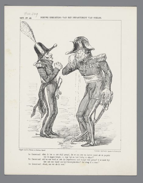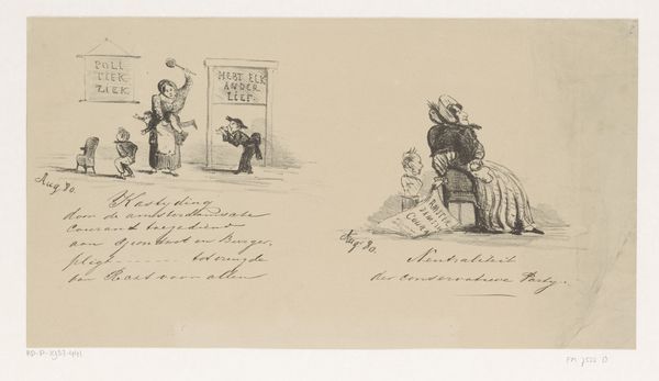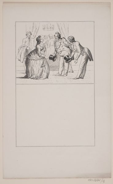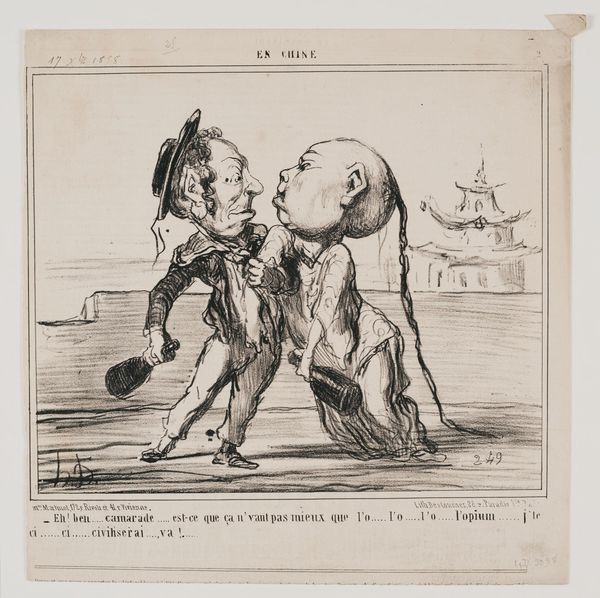 Editor: So, this is Honoré Daumier's lithograph, seemingly untitled but often referred to as "Taking Advantage of the Right Moment." It's… intense. The caricatures are so unflattering, and the subject matter is, well, jarring. What do you make of this piece? Curator: Jarring is certainly one word for it! Daumier, bless his satirical heart, doesn’t hold back, does he? For me, it's a brutal visual commentary on the Opium Wars. Look at the exaggerated features, the power dynamic. Do you see the symbolism in the Western figure forcing the opium? Editor: Absolutely. It's hard to miss the exploitation. I suppose I didn't realize Daumier was this… direct. Curator: He was a man of his time, a sharp observer. This piece makes me think about power imbalances and how they’re so easily… packaged. Editor: It really hits you, doesn't it? I see it differently now, thanks. Curator: That’s the power of art, isn’t it? To make us question, to feel something, even if it's uncomfortable.