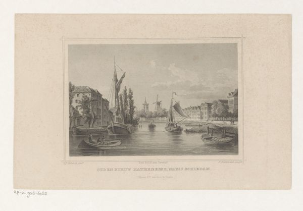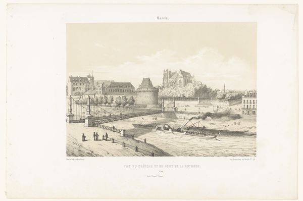 Curator: This is Léon Auguste Asselineau's "View of the Fish Hall in Nantes from the Landing Stage," an etching from the mid-1850s, held at the Rijksmuseum. It's such a finely detailed piece, isn't it? What strikes you initially about it? Editor: It's fascinating how much detail Asselineau achieves with etching. I'm drawn to the activity on the waterfront; the people loading and unloading, the variety of boats… How does this depiction of everyday life tie into the broader artistic movements of the time? Curator: Well, let’s consider the labor embedded within this “everyday” scene. Romanticism often idealized nature, but here, Asselineau directs our attention to the bustling activity surrounding the fish hall—a site of intense labor. This connects with a burgeoning Realist interest in representing the lives of ordinary people, but I'd also suggest viewing it through the lens of emerging capitalist economies. Notice how the etching technique itself, as a form of mass production, mirrors the commercial activity it portrays. What do you make of that relationship? Editor: That’s a really interesting point. So the *means* of producing the image is in conversation with the image’s *subject*, the marketplace. Curator: Precisely. And think about who this print would have been *for*. Etchings like this democratized art, making it accessible to a wider consuming public beyond the elite circles who could afford paintings. The subject matter is directly tied to the intended audience, no? What are your thoughts? Editor: I hadn't considered the commercial aspect of printmaking like that. It reframes my understanding entirely. Seeing it as a commentary on labor, both within the image and in its creation, reveals so much more depth than just a simple cityscape. Curator: Exactly! The material realities of production and consumption are crucial to understanding its impact and relevance, wouldn't you agree? Editor: Absolutely! Now I see the image’s connections to society and technology; it’s more than just a pretty picture. Thanks!