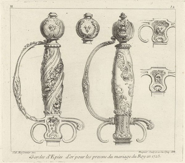 Editor: This is a print titled "Drie scharen en twee knoppen voor een wandelstok," or "Three scissors and two knobs for a cane" by Gabriel Huquier, made between 1738 and 1749. It's currently at the Rijksmuseum. The meticulous details, especially on everyday objects, are really striking. What story does this piece tell you? Curator: It reflects the 18th-century obsession with ornamentation extending even to utilitarian objects. The presence of exquisitely decorated scissors and cane knobs point towards a society deeply invested in displays of wealth and status through these possessions. Consider how the very act of engraving and disseminating these designs through prints democratizes luxury...or at least, the idea of it. Do you see how it places these items in the cultural conversation? Editor: So, these aren't just tools but symbols? Are they promoting design ideas or the aspiration to a particular lifestyle? Curator: Precisely. It serves as a visual language for aspirations to nobility. The baroque style itself signifies a deliberate break from functional simplicity. What role do you think workshops played at that time, since we see several names credited? Editor: I'd imagine there was a creative exchange between artist and craftsman. Seeing their signatures on it probably means a commitment to quality or artistic trends, especially if those designs could be distributed widely as prints. Curator: Absolutely. The image suggests an ecosystem where design, craft, and printmaking all worked together, influencing taste and social standing. It shifts the focus of art from simply the fine arts, painting and sculpture, to everyday experiences. Editor: I hadn’t considered how profoundly decorative arts were intertwined with broader social currents back then. I guess seeing everyday objects elevated to an art form has really broadened my appreciation for its social context. Curator: It’s rewarding to realize how the art of the past permeates the objects around us and how these seemingly trivial designs were statements in their time.