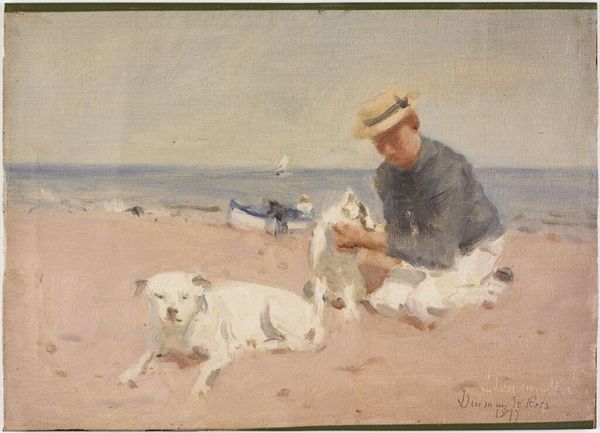 Editor: Here we have Edgar Degas's "Beach Scene," painted in 1877, rendered in oil on canvas. There’s something strikingly modern about it, almost snapshot-like in its composition. What can you tell me about how it fits within the artistic landscape of its time? Curator: This painting is incredibly interesting when considering the rise of leisure and tourism in the late 19th century. Railway lines enabled easy access to coastal areas, changing how people, especially the burgeoning middle class, spent their free time. How do you think Degas is commenting on these social shifts? Editor: Well, you see people from various social backgrounds, maybe. The people strolling in the distance versus the close figures… almost as though class is spatially represented in the artwork? Curator: Precisely. Degas is subtly portraying this new culture of leisure but not without a critical eye. The composition, while appearing spontaneous, is carefully constructed, guiding our gaze. The subdued color palette differs from other Impressionists—it is almost as if the figures blend with the landscape. Is this a statement or a visual accident? Editor: That's thought-provoking. It subverts the typical vibrant depiction of leisure and, almost as though it’s muting the excitement around this newfound pastime. Are you implying that this neutral or somber visual rendering mirrors societal observations? Curator: Perhaps Degas is hinting at the inherent constraints and social expectations, even in moments of leisure, and the act of viewing paintings like these as becoming performative. Do you think art increasingly depicted life *as it was* rather than an idyllic existence? Editor: I now see how it reflects societal conditions rather than purely aesthetics! Curator: And that’s why art history helps us interpret not just the artwork, but how we view art institutions!