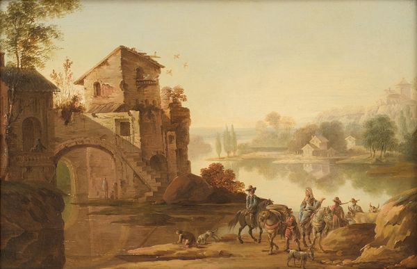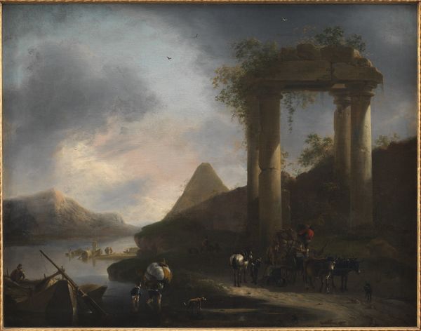 Editor: So, this is Jan Asselijn's "The Tiber River with the Ponte Molle at Sunset," painted around 1650. The light is just gorgeous. What do you see in the composition, in how the image is arranged? Curator: The arrangement strikes me as carefully structured around contrasts. Notice the solid, man-made architecture of the bridge on the right, weighed against the open, natural expanse of the landscape to the left. The bridge itself provides an interplay of light and shadow, framing smaller vignettes of human activity. It appears almost as if there is a geometric pattern within the arches to offset nature in its rawest form in the distance. Editor: That's fascinating. So the artist used structure and placement to draw our eyes to specific spots? Curator: Precisely. The warm palette creates a serene atmosphere overall. Now, observe the diagonal line created by the bridge and its reflection in the water. It dissects the canvas, further emphasizing that contrast between architectural permanence and the ever-flowing river, also mirrored by the sunset light versus shadows beneath. Editor: It's amazing how the use of diagonals gives a sensation of movement! Do you notice that also with the small figures within the bridge? Curator: Indeed, their presence provides a focal point that highlights the themes. Do the characters beneath the bridge have an interaction with the landscape, and each other, as the cattle wades through the river as well? It’s a juxtaposition. I see not just a pretty picture, but a deeper commentary on human intervention within the natural world and a perspective on classical ruin within landscape painting. Editor: I'm now noticing so many relationships. This image makes me want to dive deeper. Curator: Good. Because the best works continue to yield fresh interpretations.