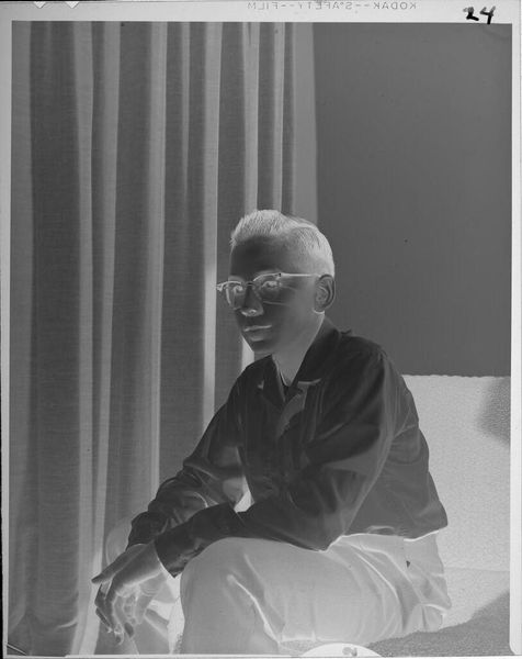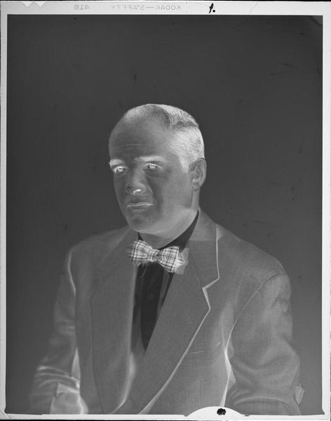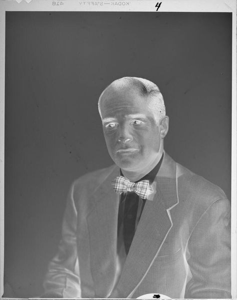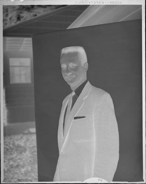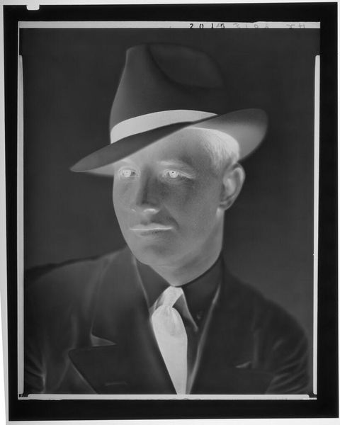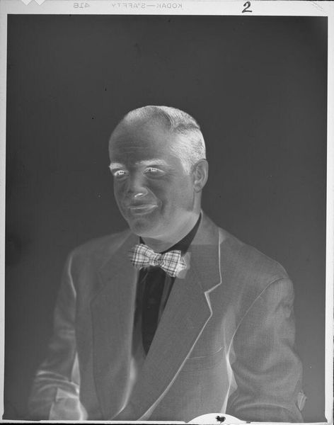 Curator: This is an untitled portrait of a man wearing a coat and bowtie, created by Lucian and Mary Brown. It's a photographic negative, quite small. Editor: The inverted tones give it an otherworldly feel. There’s a starkness, almost an interrogation, in this reversal of light and shadow. Curator: Consider this within the context of portraiture, especially its function for marginalized communities. Photographic portraits provided a means for self-representation and agency. Editor: The bowtie stands out, a symbol of bourgeois respectability, perhaps adopted or imposed. It speaks of codes and conventions. Curator: Precisely. This image invites us to question who is represented, and on whose terms. What power dynamics are at play in this depiction? Editor: The man’s gaze, though inverted, seems direct, engaging us. A silent challenge to assumptions. It makes one wonder about the sitter's story. Curator: Indeed. It's a reminder that every image carries the weight of social and historical context. Editor: And that even negatives hold the potential for powerful visual narratives.