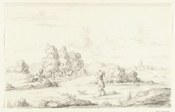 Editor: Here we have "Landschap met hoeve," or "Landscape with Farmhouse" by Lievin Cruyl, dating from 1650 to 1720. It's rendered with etching and ink, a simple yet engaging Dutch Golden Age landscape. What I find most captivating is the tranquility it evokes. It’s so detailed, but still has this very dreamlike quality. What do you see in this piece? Curator: A rural snapshot, almost meditative. It feels like stealing a glance into a simpler world. You know, it makes me wonder about the daily lives tucked within those small details— the horses grazing, those figures resting in the field… there’s such ordinary beauty here. It reminds me a bit of those quiet moments we all crave. Does the detail pull you in? Or is it the grand, open landscape itself? Editor: I think it's the combination of both. The farmhouse, the trees—they feel almost hyper-realistic when you look closely. But then the horizon stretches on and on... How do you think Cruyl captured that balance? Curator: I imagine a very patient artist. Etching is meticulous, each line a deliberate choice. And here, that precision amplifies the pastoral idyll. I think Cruyl wants us to linger in the here and now, but also offers us a sense of limitless possibilities—the calm after the (Dutch Golden Age) storm, perhaps? It makes you feel hopeful, doesn’t it? Editor: It really does. I think I understand why this print resonates so much. The close attention to detail almost makes you consider that even in a peaceful, serene setting there's detail, there's still activity, even. Curator: Absolutely. Sometimes it's the smallest of stories that carry the biggest meanings, which perhaps make us feel more human ourselves.