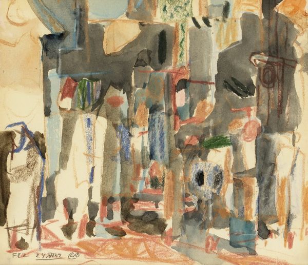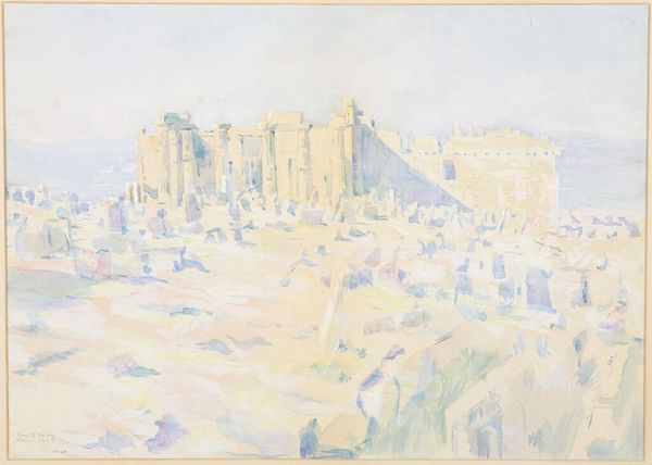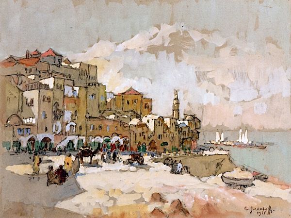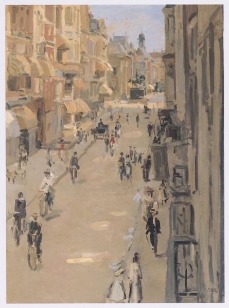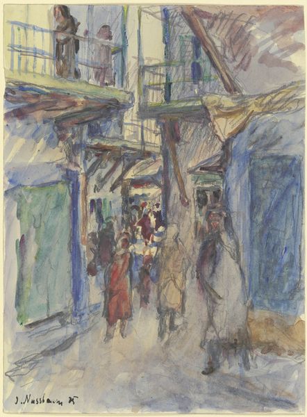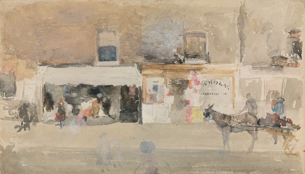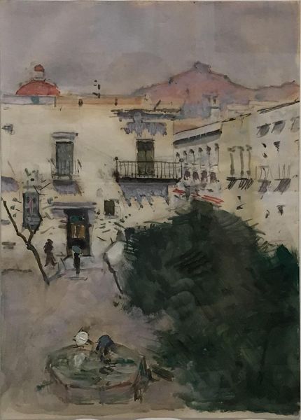 Curator: Here we have Denman Waldo Ross's watercolor, "Street Scene, Mexico," housed at the Harvard Art Museums. It captures a bustling marketplace. Editor: My first impression is of a dreamlike quality, an almost faded memory. The muted palette evokes a sense of nostalgia or perhaps even the passage of time. Curator: Notice the composition, how the artist directs the eye through a careful arrangement of forms. See the architectural lines converging to a central, almost obscured, focal point. Editor: The figures, though small, feel symbolic. They echo the energy and enduring cultural rituals of Mexican marketplaces, places of trade and community. Curator: Exactly. The artist's subtle color choices create a cohesive, balanced whole, showcasing the interplay of light and shadow. Editor: It is a compelling piece, a convergence of the personal and the cultural, expressed through skillful artistry. Curator: Indeed. A wonderful synthesis of form and content.
