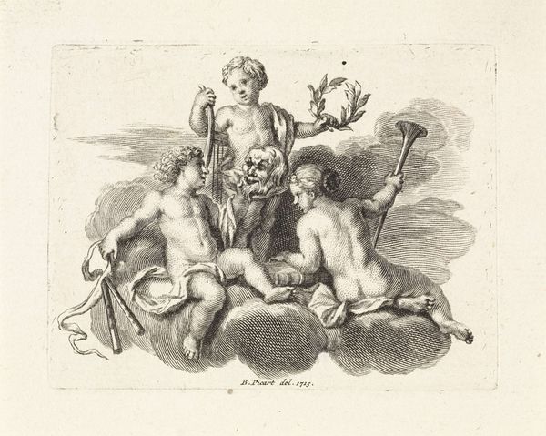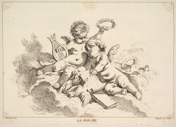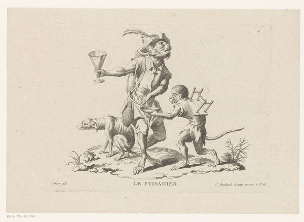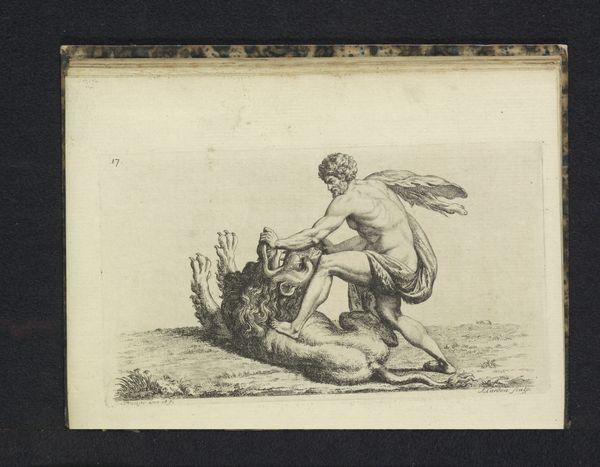 Gerhard Ludvig Lahde created this vignette with a woman, a seated young man, and a unicorn using an etching technique. Notice how Lahde's composition creates a tableau of stark contrasts through the sharp lines, juxtaposing mythical and mundane elements. The texture is defined by the etcher's marks, which give a tactile quality despite the image's small scale. A blindfolded woman is holding a knife to the head of the young man who is sitting on a cube with a triangle. Here, the artist seems to be exploring themes of justice and sacrifice, playing with semiotic systems of signs and symbols. The unicorn is a representation of purity, juxtaposed with the mundane figures of the man, dog and griffin. This challenges fixed meanings, inviting viewers to question the relationship between the ideal and the real. The formal tension between line and form serves not just an aesthetic purpose but also as a vehicle for philosophical discourse. This artwork remains open to ongoing interpretation, reflecting the ever-evolving relationship between art and its viewers.