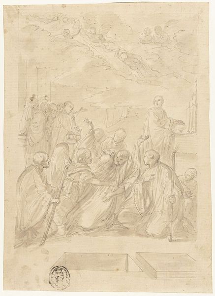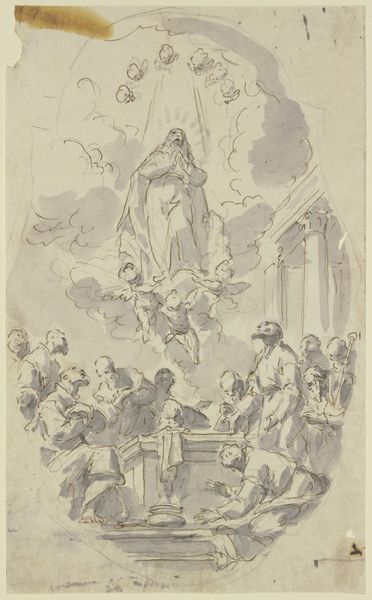Curator: Welcome. We’re standing before "The Virgin and Child Adored by Monks and Others," a pen and brown ink drawing by Giovanni Battista Tiepolo, created between 1727 and 1738. It resides here at the Metropolitan Museum of Art. Editor: Wow. Immediately, I feel this weight—but a gorgeous kind of weight. The composition is dense, with all these figures pressing in. There is almost a kind of hazy quality... are my eyes deceiving me? It almost evokes the smell of old paper and candle wax, if paintings could smell. Curator: Indeed, the brown ink lends itself to a monochromatic schema, where light and shadow are critical elements structuring the visual narrative. Tiepolo has captured a certain spatial complexity here—note how he guides the eye using contrasts. Editor: I am totally taken with that contrast, or the intention of it. Some of these lines are barely there. Tell me more, because I am instantly drawn in but am unsure why... it feels intentionally not quite done. Curator: What fascinates me is how Tiepolo exploits line and wash techniques to define form and volume within a relatively sparse field. Consider how this deployment underscores the devotional tone and establishes a hierarchical order. Observe how all figures converge spatially. It could be a play rehearsal almost... Editor: It really could be. What I adore about works on paper is how immediate the creation seems to be. Tiepolo has offered an opportunity here for real magic. So simple. But the sum effect? Divine. It makes me think about ephemerality versus that constant in art, religion. Curator: And that’s exactly what gives the image its dynamic force, its tension between presence and absence, which leads the viewer towards that conceptualization of divine grace. The texture itself reinforces that impression. Editor: Thanks, Tiepolo, you scamp. Yet another reason why museums are good for my soul. Thank you. Curator: Agreed, the artist evokes our need to study structure, purpose and its lasting visual impact in drawing.