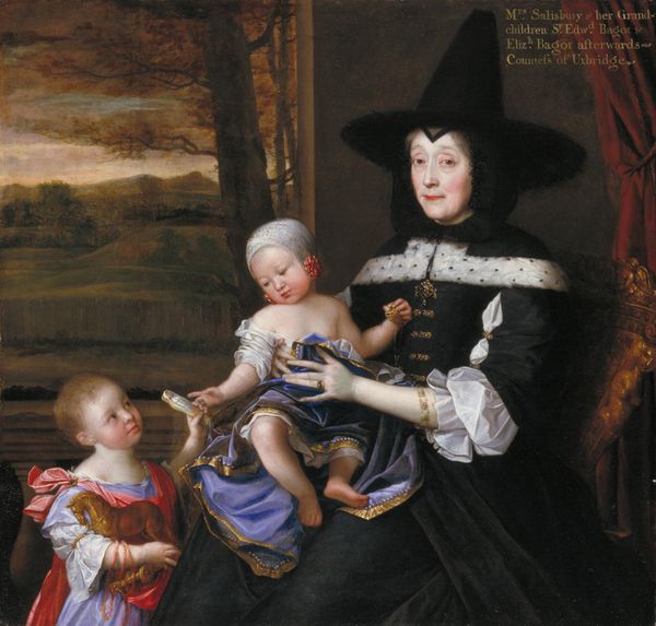Karel van Mander III painted "The Artist with his Family" using oil on canvas. Notice the formal arrangement of figures set against a draped backdrop. The artist, positioned to the left, stands slightly apart, while the two women are centrally located, their hands gently clasped over a book. The composition’s somber palette contributes to the reflective mood, offset by the detailed rendering of textures, from the sheen of the fabric to the subtle gradations of skin tones. This focus on materiality invites us to consider the function of portraiture at the time, not just as representation but as a display of social identity. The book becomes a signifier of learning and status, with the family's arrangement suggesting a narrative about lineage, knowledge, and familial bonds. Van Mander's painting exists within a cultural discourse where surface appearances are imbued with deeper meanings. The work serves as an exploration into how we construct and perceive identity through visual cues, inviting a continuous questioning of appearances and social constructs.