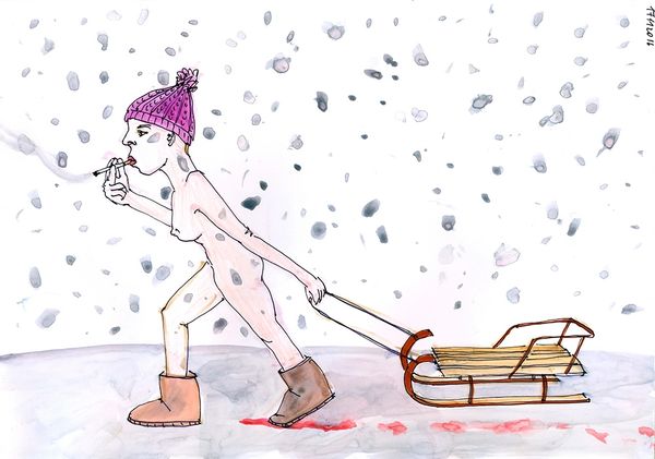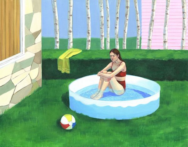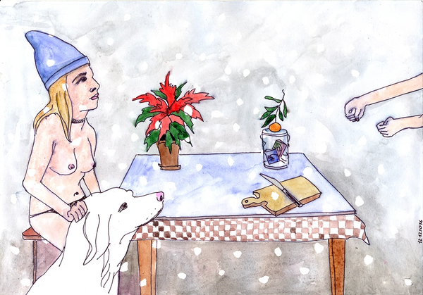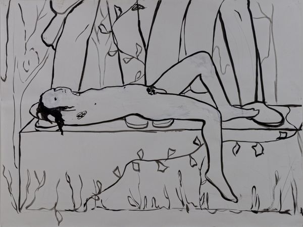 Curator: Welcome. We are standing before a work from the "Kinder Album" series, an untitled watercolour painting from 2016. Editor: It certainly makes a startling impression! There's a rawness in the line work that creates a palpable sense of unease... Almost like a half-remembered dream tinged with melancholy. Curator: Precisely. Observe the composition: a stark room bisected by the strong horizontal of the doorway, leading our gaze into a further room where we observe what seems to be Santa stuck in the chimney. To the right a large vacant, undefined space. Editor: Note how the application of the watercolour, so translucent in areas, seems at odds with the density of detail around Santa. It underscores this dreamlike state. You almost feel you can feel the artist at work, grappling with process and content at once. It almost challenges the notion of high art by highlighting an exploratory feel. Curator: I find the juxtaposition of the figures—the central, forlorn nude and the children peeking—creates an enigmatic tension. It reminds me of similar uses of spatial and interpersonal tensions present within paintings such as those produced by Balthus. Editor: True, there's a discomfort created around traditional iconography, what is normally wholesome rendered uncomfortably. The use of watercolour lends itself so readily to a sense of ethereal vulnerability, its fragility mirrors the subject matter and adds another dimension to our reading. I think it becomes very evident when discussing erotic-art like this, you have to give more respect to the skill. Curator: It begs questions about childhood, the loss of innocence, the subversion of holiday expectations—a true provocation that exists formally and in its engagement with these varied semiotic elements. Editor: The piece offers a strange and unsettling commentary that feels intensely intimate. We get a brief peek into the mind of the artist which only leads to further, and deeper questions about the artistic journey itself.