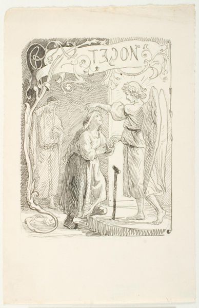 Editor: This is a sketch by Lorenz Frølich from 1866-67, titled "Illustration draft for H.C. Andersen, The Snowman," rendered in ink. It’s a curious drawing; there's a stark contrast between the detailed figures and the almost unfinished lower section. What kind of story do you think this intends to tell? Curator: The image brings forth compelling narratives about the self and society. In many ways Frølich reflects the societal attitudes of 19th century Denmark, particularly through the lens of gender roles. What do you observe about the body language of the couple? Editor: Well, they're walking closely together, but their expressions seem...apprehensive, almost? Curator: Precisely! Now, consider the snowman. It stands rigidly, a frozen entity observing them, isolated against the darkness of the forrest. In terms of its cultural relevance at the time, Romanticism highlighted folk traditions. Could this narrative possibly mirror the constricting societal expectations that the emerging middle-class experienced in 19th-century Danish society? What purpose does fiction play in our understanding of such complex times? Editor: So the snowman isn’t just a snowman; he’s representative of an almost inescapable structure? That's a profound thought. So Frølich is actually exploring something darker using this tale? Curator: Exactly! Frølich prompts us to think critically about the structures and figures we take for granted, the ‘snowmen’ that silently preside over our choices and possibilities. It asks about our resistance towards said figures. What would resistance in the image sound like? Editor: Maybe, drawing the snowman melting, being unbound. This really changes my perception of fairytale illustrations. I will carry such critical awareness moving forward in the program. Curator: Excellent! It's vital to recognize the quiet challenges to societal norms artists can create. Art invites that re-examination.