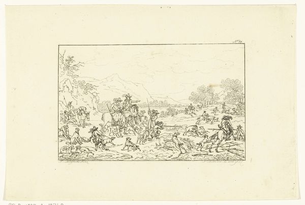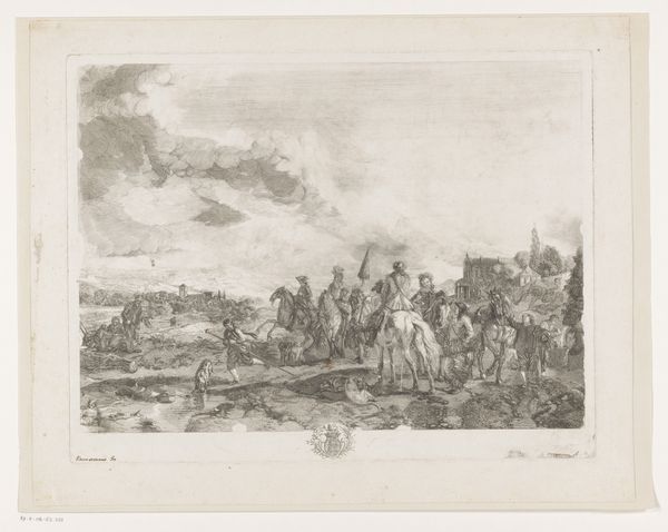 Editor: This is "Travelers Before an Inn," a drawing, engraving and print by Jean Moyreau, dating from around 1733 to 1762. It’s currently held at the Rijksmuseum. It seems almost like a snapshot of everyday life, but the lines are so meticulously crafted. What do you see when you look at it? Curator: What strikes me first is the balanced tension between line and void. The figures are defined by intricate lines, primarily using engraving, while the landscape employs the drawing and print medium to add depth through variation in lightness and darkness. This dichotomy creates a captivating visual rhythm, drawing the eye across the plane. Note how the foreground is filled with carefully etched figures, offset against the softer, airier qualities as it progresses into the distance, where a line fades almost to vanishing point. Editor: That’s a wonderful point. The foreground really does pull you in, almost like actors on a stage. Does this division serve more than just a compositional purpose? Curator: Consider the textural diversity achieved through line variation. Moyreau’s skilled use of hatching and cross-hatching constructs form and modulates light, rendering the fabric of garments, the musculature of the horses, and even the density of the foliage. Ask yourself how the strategic placement of the darker, more densely worked areas contrast with the more loosely sketched regions affect your understanding? Editor: So it's the tension and harmony within the print that matters more than an external narrative? Curator: Precisely. Moyreau, through a mastery of line and composition, elevates a common scene to a plane of enduring aesthetic value. It’s not just a landscape. Instead, it presents us a study in contrasts, an investigation of the optical richness inherent to a singular two-dimensional medium. Editor: I’m beginning to see it as less about the scene itself and more about how Moyreau chose to represent it with such remarkable skill. Thanks for shedding light on it.