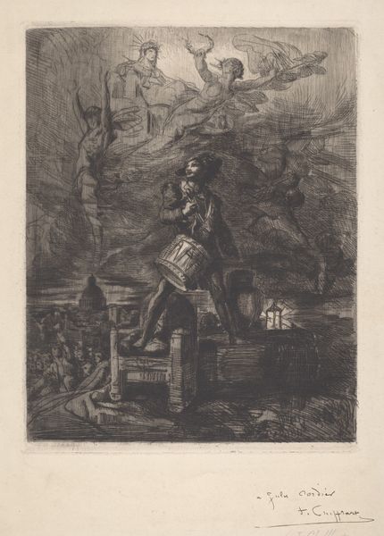 Editor: Here we have Francesco Casanova's "Battle Scene," an engraving printed sometime between 1727 and 1800, currently held at the Metropolitan Museum of Art. The flurry of lines creates a visually chaotic yet dynamic scene. How do you interpret this work, focusing on its visual structure? Curator: This engraving certainly presents a fascinating study in line and form. Note how Casanova employs dense, interwoven lines to create areas of deep shadow and texture, particularly in the background and around the figures. What effect does this density have on your reading of the piece? Editor: It definitely intensifies the drama. The stark contrast between light and shadow, built through these lines, really makes the figures stand out despite the chaos around them. It also suggests depth and dimension even though it's a flat, printed image. Curator: Precisely. And consider the strategic use of hatching and cross-hatching to build tonal values. Observe, also, the energetic diagonals that inject movement. These converging lines create vectors which visually propel the viewer's gaze. Where does your eye naturally go, given these compositional choices? Editor: I think I’m drawn towards the figure holding the flag and the one sprawled beneath his feet, which become a central point of interest. The artist wants you to examine it very intensely with such dense composition. Curator: And rightly so, the focal area displays Casanova’s masterful treatment of surface detail. Notice how variations in line weight define the folds of the garments and the tension of the muscles, offering dynamism to this battle scene. Editor: Seeing how the density of lines and directional composition are constructed gives an alternative viewing point from the general thematic interpretation. The form is as interesting as the content it illustrates! Curator: Indeed. Analyzing the formal qualities in this way reveals the underlying structure that dictates our emotional response to the artwork.