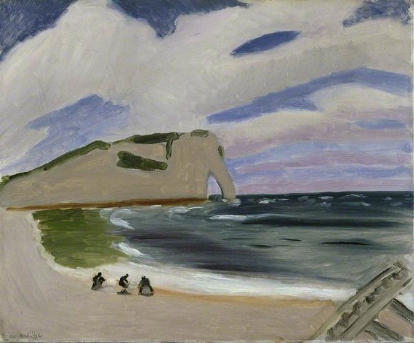 Curator: This is Winifred Knights' oil painting, "Beer, Devon." Editor: It's stark, isn't it? A somewhat subdued coastal view. The cool greys and blues give it a melancholy feel, a quiet, solitary kind of beauty. Curator: Coastal landscapes often serve as symbols of transition and the sublime, don't they? The cliffs could represent enduring strength, while the sea mirrors the depth and fluctuation of emotions. There's something almost romantic in its restraint. Editor: Perhaps. But look at the texture – the visible brushstrokes creating a rough surface on both the water and the land. The paint application itself contributes to this ruggedness. Were affordable, pre-mixed paints easily available in the period she was painting this, allowing the artist this direct interaction? The labor of physically creating this landscape seems very present. Curator: Interesting point. Maybe Knights aimed to evoke not only the place itself, but also its relationship with time. The coastal landscapes of Devon hold geological narratives spanning millennia. The visual evidence is in the strata of cliffs which have stood witness to so much change. The painter is thus capturing a place and its histories. Editor: Precisely. And understanding the quality, accessibility, and constraints of materials would further illuminate the artistic choices she made in capturing that. Curator: I’m taken by how these muted tones seem to deepen its symbolic resonance, giving rise to thoughts that surpass mere documentation of a place. It speaks to more universal experiences. Editor: It seems a careful study in how materiality and method inform meaning as much as imagery does, wouldn’t you say? A conversation between land, sea and making visible its process. Curator: Absolutely, understanding the interplay of symbols alongside materials certainly enriches our perspective. Editor: Indeed, there's value in acknowledging both the hand and the head in crafting a work such as this.