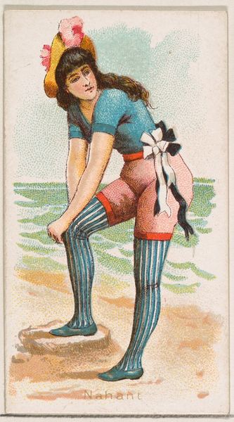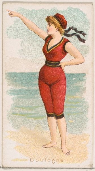 Curator: This is an advertisement piece for William S. Kimball & Company from 1889, titled “Narragansett Pier, from the Fancy Bathers series,” and it depicts a woman on a beach in a swimming costume. It’s rendered with coloured pencils, offering a glimpse into late 19th-century leisure and consumer culture. Editor: My first impression is that the rendering is fascinatingly awkward and sweet; it’s full of conflicting cues between the rather bulky bathing suit and these incredibly dainty ribbon details that feel so contradictory. It almost becomes a kind of caricature, right? Curator: Precisely. This “fancy bather” isn't just a portrait; it reflects idealized femininity within a rapidly changing social context. Narragansett Pier, Rhode Island, was known as a playground for the upper class, and such images would circulate through trade cards meant to evoke that kind of lifestyle. It projects a sort of aspirational image, even with the potentially absurd design of the bathing costume. Editor: Let's discuss the form here, it seems significant. Her raised arm shading her eyes acts as a clear directional cue that leads the viewer to the open, light horizon beyond. How do you read the emotional tone given this composition? Curator: The gesture of shielding the eyes does suggest expectation, perhaps longing. Simultaneously, though, the figure also invites—the other arm gesturing almost in a beckoning manner. But I would be more inclined to examine the period and what this woman symbolized to the changing perceptions of a female role in the era. Were her actions perceived as defiant, and what did this do to her sense of identity at that time? The bathing suit also alludes to a change in mores; she is partially covered, and partially exposed, so to speak. Editor: That's intriguing. Seeing her partially shaded expression in the water only now intensifies the semiotic puzzle of visibility and veiling here. So the very nature of representation within a commodity item raises further interpretative issues about intent, influence, and, as you suggest, cultural expectations of that era. Curator: Ultimately, this is just a humble piece, designed to promote products, yet when considered from symbolic angles and social considerations, these kinds of works provide useful portals to understanding and deconstructing collective desires, ideals, and societal projections in a time of major transformations. Editor: I think the strength of a piece such as this relies upon the way the visual tension is translated through compositional methods. As such, an advertisement such as this serves as a key for reading our past's hidden ideologies.