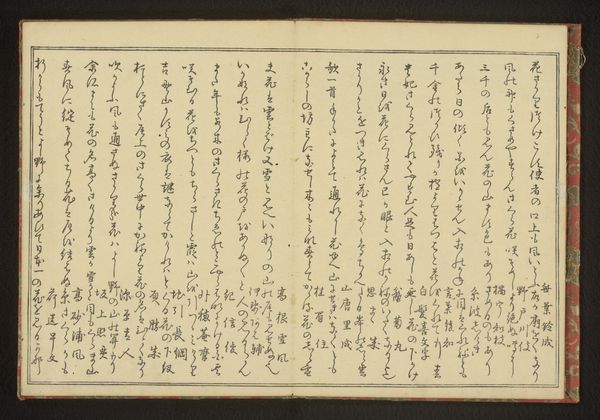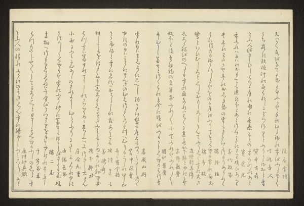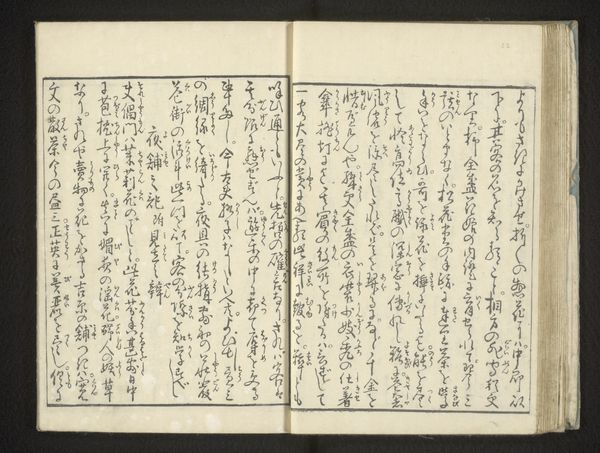 This is a page from "Tekst" by Jippensha Ikku, created with woodblock printing, during the Edo period in Japan. The flowing script, brushed onto the block and then printed, hints at a vibrant literary culture beyond the elite circles of the court. Woodblock printing democratized access to stories and ideas, fostering new audiences. The "Floating World," or ukiyo, of Edo Japan, celebrated pleasure and artistic expression, even as it bumped up against the strict social hierarchies enforced by the Shogunate. We see a tension here: the elegance of calligraphy meets the accessibility of mass production. To truly understand this text, we'd need to delve into Edo-period publishing, exploring censorship practices, the rise of the merchant class, and the social function of popular literature. We might ask, how did the stories in "Tekst" reflect or challenge the values of its time? What role did these kinds of books play in shaping social identities and cultural attitudes? It's a cultural historian's job to piece together these contexts.