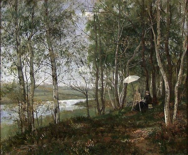 Curator: Welcome. We're standing before "October", an oil painting executed in 1883 by Efim Volkov. Editor: A somber palette, certainly. Muted greens and browns dominate. The eye is drawn back by those white birch trunks which provide a stark, rhythmic structure. It feels rather still, a melancholic quiet. Curator: Volkov worked en plein air, a commitment to capturing the direct impression of nature. Note the single figure by the river, perhaps representing solitude, a common trope in landscape painting linked to deeper themes. Editor: Yes, and the arrangement of the birch trees as a screen partially veiling the river constructs a liminal space, a visual barrier and gateway simultaneously. The painting uses texture expertly: compare the dense, stippled foreground to the smooth water. Curator: Beyond that, in Russian culture, birches have tremendous symbolic value, representing purity, resilience, and the Russian spirit itself. Think of them as embodiments of national identity and folklore. Editor: Intuitively, the upright rhythm of the birch forest gives rise to a vertical compositional field—but the horizontal flow of the river counters and establishes a formal dichotomy: tension within harmony, nature’s oppositional character perhaps? Curator: Perhaps. There's a sense of seasonal transition, of nature quietly surrendering to the inevitable. October: a period weighted with nostalgia, facing decline. This carries broader themes about temporality, mortality... Editor: Absolutely. Formally, though, there's an interesting diffusion of light, handled impressionistically, but with an undercurrent of realism typical of much late 19th century Russian painting, holding the artwork compositionally between both worlds. Curator: Reflecting on Volkov’s piece, the visible world often echoes interior landscapes—this "October" evokes feelings both individual and universal. Editor: An artful example of nature writing translated into brushstrokes. Each considered decision from subject to coloration gives it resonance that outstrips simple representation.