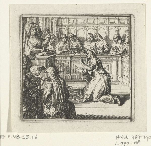 This print, made by Crispijn van de Passe the Younger, probably in the early 17th century, is an intricate etching, a process that involves coating a metal plate with wax, drawing a design, and then using acid to bite into the exposed lines, before finally inking and printing the plate. Looking closely, the fine lines create a detailed depiction of a brothel scene. The act of etching itself, requiring meticulous skill and time, mirrors the careful construction of social facades depicted in the scene. Each line, etched with purpose, contributes to the overall narrative of the artwork, reflecting the social and economic transactions within. This print serves as a "Mirror" reflecting the behaviors of courtiers of the time. The artist's labor is not just in the physical act of creation, but also in the social commentary embedded within the work. The materials and processes of printmaking elevate the scene, turning an image of everyday life into a significant cultural artifact.