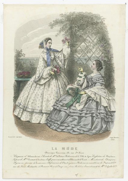 Curator: This lithograph and watercolor print is "Le Bon Ton, Journal des Modes, 1861, No. 357," crafted by Jean Charles Pardinel in 1861. It’s more than just a pretty picture, wouldn't you agree? Editor: Initially, I'm struck by the cool color palette. The soft blues and grays lend a certain calm, almost melancholy air to the figures and the setting. The shapes, particularly the large skirts, dominate the visual field, don't they? Curator: Absolutely, and that tranquility is carefully constructed. The print comes from a journal aimed at upper-class Parisian women, dictating trends not merely in clothing but in behavior and aspirations. The subjects exemplify the ideals of femininity during the Second Empire. Motherhood as performance, a woman's position reliant on male approval, etcetera... It presents a fabricated ideal. Editor: While your points about societal constraints are valid, observe the meticulous detail in rendering the textures—the subtle sheen of the fabric, the delicate lace. It transcends simple documentation, rising into the realm of art through the skill of its execution. And the subtle washes in watercolor that tint the dresses with blues and silvers--masterful. Curator: Those very details enforce a culture of rigid expectations and reinforce hierarchies of power. To see merely beauty overlooks that the 'romantic' genre and 'decorative arts' often sanitize and beautify strict social conditions for many women. The illustration naturalizes gendered norms and roles. Editor: Perhaps, but I cannot disregard the visual language—the formal interplay of line and color, the delicate balance achieved between detail and simplicity, even in their fashionable constraints. Semiotics is important, after all. The language of adornment, dressmaking, presentation... Curator: I agree that these components warrant inspection but always in service to deconstructing hegemonic narratives. Ignoring that larger social-historical setting makes us complicit in reinforcing it. Editor: And contextual knowledge enriches but should never obscure the work’s inherent aesthetic value. One does not need a social manifesto to witness a work of art as it is displayed before you. Curator: A crucial tension, wouldn’t you agree, when examining artwork such as this—seeing it as beautiful as well as an artifact that bears social meanings? Editor: Indeed. We've perhaps unveiled the intricate dance between aesthetics and ideology embodied within Pardinel's work.