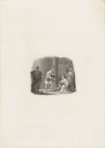Editor: We're looking at "Coosje en haar moeder," or "Coosje and her Mother," an engraving done in 1792 by Reinier Vinkeles. There's something really touching about its intimacy – almost a captured moment of everyday life. I’m drawn to the clean lines and the almost austere simplicity. How do you interpret this work? Curator: Isn’t it lovely? It whispers rather than shouts, doesn't it? The beauty, for me, lies in that quiet domesticity. Think about the time! Neo-classicism was all the rage - order and reason! Here, Vinkeles uses that precision of line not for grand narratives but for the soft lines of a mother guiding her child. The space isn't opulent. And see the composition. Mother, child, and dog? Domestic stability perhaps? What draws you particularly to this intimate moment? Editor: That makes me appreciate the context much more – it’s not just a drawing of a mother and daughter, it's a statement against the prevailing artistic climate. I notice that there’s almost a mirror-like quality between the mom and child as well! And it does really lend itself to a quiet, still observation. Curator: Exactly! The simplicity focuses us. We're invited not just to look, but to almost enter their space. And that linear style, pared down to only what is essential, brings an emotional nakedness. I’m curious, though: do you feel the emotions or narrative? Do you imagine what their day entails? Editor: The emotional side does come through for me but it is subtle, so the drawing opens my own thoughts and stories about a typical family. But ultimately, this makes me consider how revolutionary art is connected to quiet and still, intimate, observations. Curator: Indeed, revolution can bloom even in the quietest of rooms.