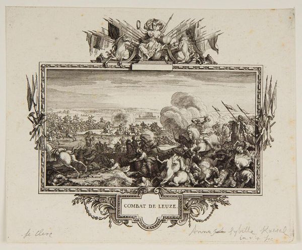 Johanna Sibylla Küsel's "Slaget ved Leuze," is a dynamic engraving, notable for its detailed rendering of a chaotic battle scene. The artwork uses a tight composition to convey the intensity and close quarters of the conflict. The engraving’s structure employs a clear foreground, middle ground, and background to create depth, with the most dramatic action staged front and centre. Küsel uses line work to differentiate textures and forms, from the billowing smoke of cannons to the musculature of horses and soldiers. The piece is framed with decorative elements, including allegorical figures and military symbols, which serve to elevate the scene and imbue it with heroic qualities. This combination of realistic depiction and symbolic framing aligns with the period's approach to history painting, aiming to inform and inspire through the visual narrative. Consider how Küsel uses the contrast between the ordered frame and the disordered battle to provoke thought. The contrast is a semiotic device, questioning the glorification of war.