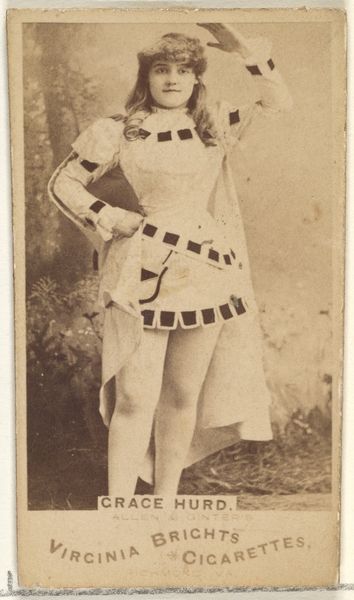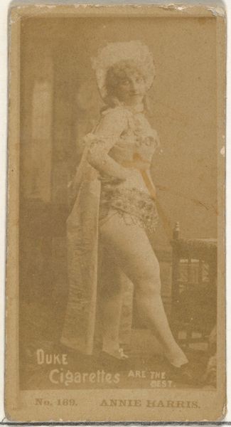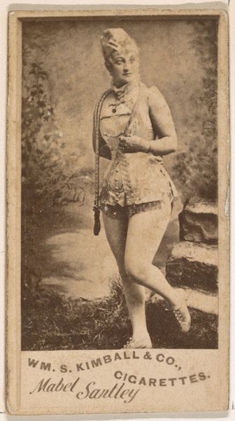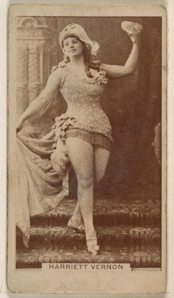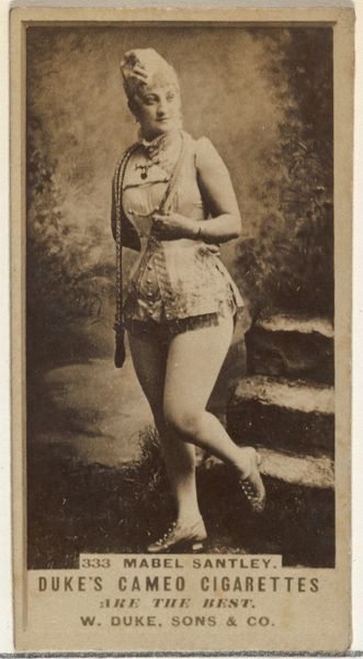 Curator: What a dreamy sepia tone. This card, "M'lle Rosalind," produced between 1885 and 1891 by Allen & Ginter, is part of a series for Virginia Brights Cigarettes, currently residing at the Metropolitan Museum. There's something so evocative about these small portraits of performers. What's your immediate impression? Editor: There is an aura of playful defiance, almost like she knows she’s playing a role. It feels staged yet her expression carries such conviction. Her armbands and decorative collar point to something vaguely ancient, maybe Egyptian-inspired? Curator: Precisely! It aligns with the late 19th-century fascination with Orientalism and Japonisme—a fusion of styles where exoticism became fashionable, remember? These cards were wildly popular. Small collectibles portraying actors, actresses, athletes... miniature windows into another world tucked inside cigarette packs. Editor: So this ‘M'lle Rosalind’ becomes both an individual and a type, then. I'm curious about her gestures and accoutrements. The ornate wall behind her makes me think of something very intentional, stylized. Was it all constructed? The set design has its own message. Curator: Indeed. The background does seem constructed but reinforces a feeling of artifice. This tension adds intrigue—is she an exotic muse or a commodity packaged to sell cigarettes? Allen and Ginter aimed at upwardly mobile consumers, these cards created a perceived sophisticated air. Editor: Which adds another layer, the implicit link between aspiration and… well, addiction. Considering how visual language persists, it's amazing how packaging uses layered meanings and associations. We have beautiful performance held in tandem with something deeply unhealthy. Curator: Absolutely. It's a fascinating intersection of performance, exoticism, and the burgeoning advertising industry, perfectly encapsulating its era's complex social and cultural currents. It really is fascinating how small ephemera offer such potent stories. Editor: Thinking about it this way brings forth the understanding that every element holds intention – from Rosalind’s gaze to the border enclosing her. Thanks, it seems small images can whisper volumes.